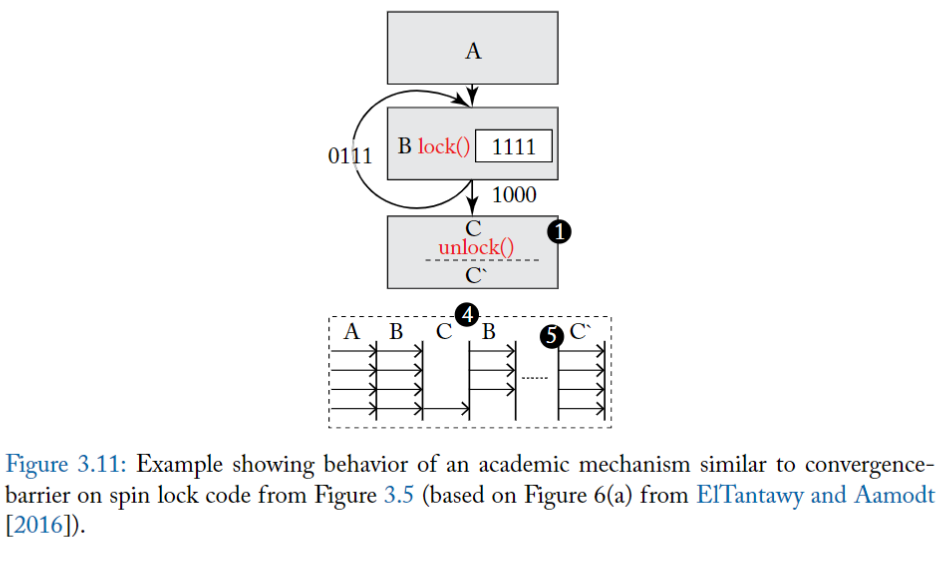為了描述 SIMT stack,我們使用圖 3.2 展示了包含兩個嵌套在 do-while 循環中的分支的 CUDA C 程式碼,圖 3.3 展示了對應的 PTX。圖 3.4,再現了 Fung 等人 [Fung et al., 2007] 論文中的圖 5,說明了此程式碼如何與 SIMT stack 交互。