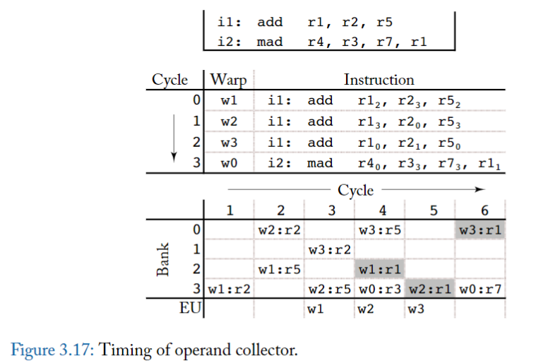 arbitrator 選擇最多4個 (圖中硬體是4個 bank, 實際上可能有32個或更多) 不衝突的存取 request 傳送到register file。為了減少 crossbar 和 Collector Unit 的面積,每個 Collector Unit 每週期只接受一個 operand 。
