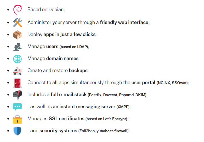 * Even if YunoHost can handle multiple domains and multiple users, it is **not meant to be a mutualized system** (dvs ikke til shared hosting)