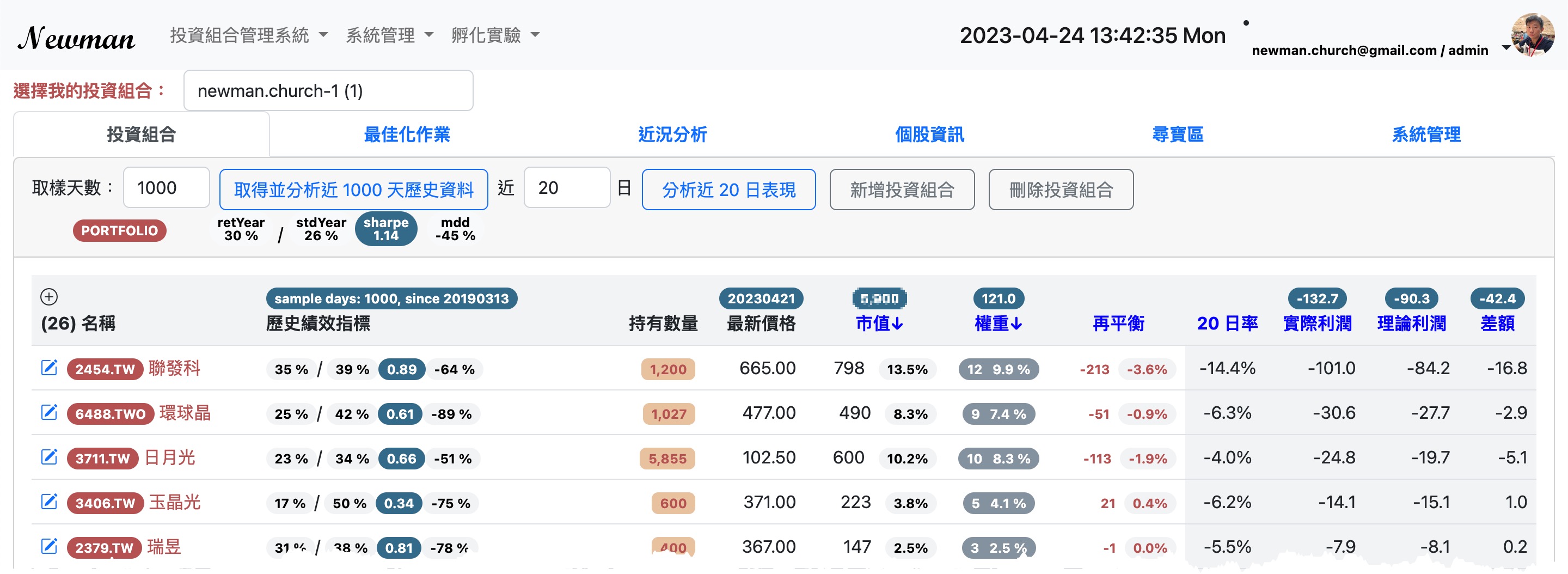 --- tags: 新人資訊 description: 投資組合 資產配置 GA: G-YWCCFEGXSJ --- [Home](https://hackmd.io/@newman/portal) - [新人資訊](https://hackmd.io/@newman/portal-info) # 應用-資產配置管理系統 part.14:管什麼?第一是淨值,第二是對淨值成長之貢獻因素 「沒賣就沒賠」通常是深度套牢者自我安慰的想法!錯的不是深度套牢,卓越的基本面投資者也會經歷這些,差別在於想法上關心的重點;若思路進入死胡同,會直接影響讓後續決策亂無章法。 給出詳實的交易紀錄是經紀商的責任,卻不該是投資者的重心,他們只不過用粗糙的先進先出的方法認列,這些數字就是容易誤導人的陷阱。公開發行的企業被規定要定期發布財報,所以「認列」成為每個月底季底的重中至重,不然就不會有所謂「作帳行情」之類的名詞出現。作帳可以提升行情嗎?這其實是很奇怪不合理的,但當前商業運作監管制度就是這樣,漸漸大家就見怪不怪了,但對於一個自負盈虧的自營商就不需有這窠臼了,應該誠實的面對最根本的「淨值」! 在每日的行情波動之後,不管淨值的形式是證券或現金,在心理上就應該即刻「認列」了,關心的是現金水位是否足夠安全,持有證券是否優質或持續存在獲利機會。突然發現自己已經許久對「帳上損益」視而不見了,幾乎忘了它的存在了,自然也就不會有月底季底為了美化帳面而有的任何奇怪的投資決策。 但淨值包含了證券與現金,甚至各有數個帳戶,我所思考的就是如何用系統管好證券部位,至於現金帳戶就是使用者的責任了,千萬不要與日常花費混在一起,這樣可以讓每天的帳務單純化,只要執行一個簡單的加法即可。 至於證券部位,任何時候只要知道持有數量 * 最新收盤價,這券商軟體就有了,還需要我的軟體嗎?是的,那眉角就是需要「細項分解」,需要知道貢獻來源。貢獻組成有兩個維度,一是證券種類,一是時間,系統會分解出「每一個標的」的「每日貢獻金額」:  這是系統的「近況分析」頁籤,針對每一個標的,用兩個圖完美呈現日精度的四大資訊:<font color=red>價格,價差,部位,累計利潤</font>。上漲時部位越大越有利,下跌時則相反,這道理很簡單。所以本系統的底層邏輯絕不僅僅是資產配置和買進持有,更蘊含著更積極的價差操作;惟基本架構在那兒釘住,有助於使用者穩住陣腳,不至於偏離理論配置權重太多。以配置權重為基礎,加上小部位的價差操作,這就是我對「長線保護短線」的演繹,也是政府推動「零股交易」這德政後賜給小散戶的機會。既然部位會比較頻繁的變來變去,就需要像以上這樣展開到每天才可以掌握。 注意到「淨值貢獻金額」,有可能是所謂的「已實現」或「未實現」利潤,這個以淨值為根本的記帳方式,目前尚未看到有什麼系統可以做到。如上例中 4/19 增持一小部位,成功享受到 4/20 的漲幅,雖未賣出持股但還是扎實的貢獻到淨值中。4/21 因大漲而出脫一部分部位,那個淨值增長的一小部位就會換成現金了,後續若再漲當然獲利基礎會下降,但因基本配置還在,還是可以參與到漲幅,反之若下跌,就有資金可以尋求加碼的機會。這樣可以清楚了解本標的的操作績效,在每一個標的的細節上耕耘,終究會反映在整體的淨值增長上,每天日結帳的總成績單,就是系統的曝險部位加總,加上銀行證券戶的總和。順帶一提,若用個股期貨為工具,則只要看權益總值即可,帳務上反而比較單純,但本質都是一樣的。總之,完全不必被券商平台的每筆的已實現、未實現、先進先出等等死板的規則綁死,暴露在「雜訊充斥」的環境,要做好投資真是難的,成不成功真的差在這些細節啊! 其實我也留下伏筆,將來也會拓展到多空因子分析,雖然目前我認為要找到有用的因子非常難,但人外有人天外有天,不需自我設限,持續探索就是了,但基礎的掌握是越穩越好的。 要管到那麽精細的資訊,是不是花大量的時間來輸入資料?答案是 no,與我原初的設計完全一樣,沒有增加一點麻煩,只要當庫存有變動時輸入一次就好了,系統用最精簡的方式紀錄下來,回推每日庫存完全沒有問題:  整個系統除了增加這每日部位的結構性改變,整個視覺配置也換然一新了,google sheet 已經完全拔除,python 引入大量運用,權限等級劃分和管制都做好了,差不多已經是個合格的商業軟體了。    我是資訊咖,不是金融咖,專注本質思考,做好人性基本且重要的事,不領薪水我驕傲,勇敢單飛終不悔,有網路處就有活路。 Newman 2023/4/24