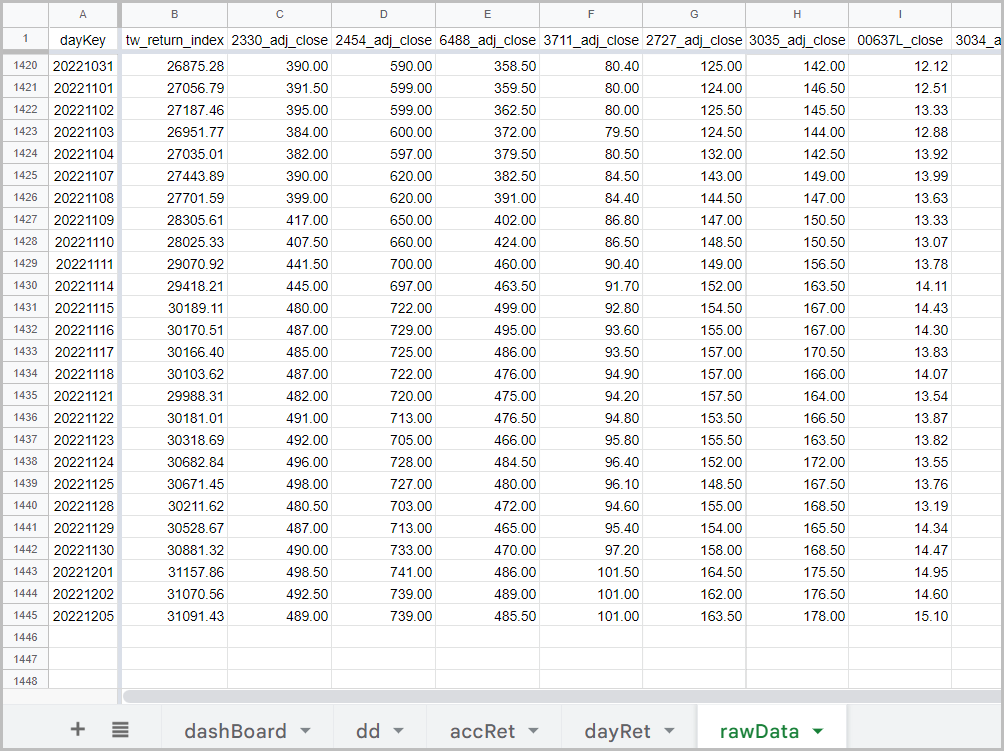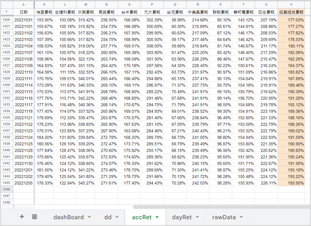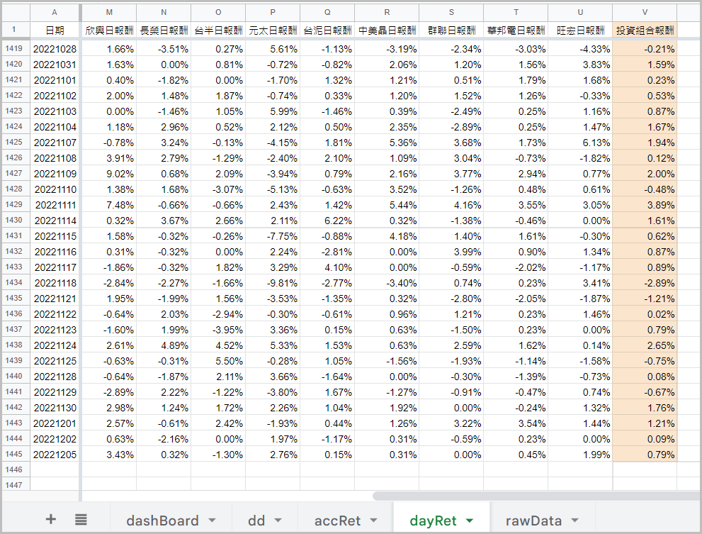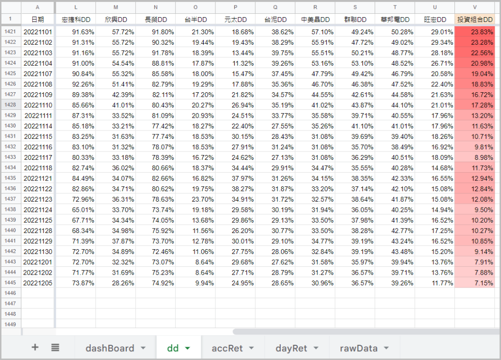 --- tags: 新人資訊 GA: G-YWCCFEGXSJ --- [新人資訊](https://hackmd.io/@newman/portal-info) # 技術-前端類-試算表超級前端果然迅速膨脹,投資組合管理系統已見雛型 繼上次闡述 excel 的糾葛之後,手中的試算表果然快速膨脹,短短幾天已經把長久擱置心裡的許多期望功能實現了!幾萬個格子自由串聯瞬間更新,這的確非常迷人,陸陸續續加入更多資產類別,分別計算報酬率相關指標和 DD,更重要的是實現了任意權重試算投資組合相關指標,變成密密麻麻的數字了,看了是不是很爽?這裡面有內行人才看得懂的門道。  一個表極大化的裝進更多資訊,這是對於真正在做事的人深處的渴望!此想法是基於多年資訊服務生涯的深刻體驗。從前與各單位重要的 key user 交手,一開始總是想要用美麗的畫面想要博得青睞,經過多回合討論後幾乎都還是被這種實務思維掰彎,他們甚至也不需要圖表,精明的主管都是對數字敏感的,一個真正有用的數字比甚麼都重要,篇幅要短,最好一頁完成!所以經常在工作績效展現時顯得尷尬,「你怎麼大半年就只做一份報表?」怎知其資訊濃度有多高,產出過程有多艱辛! 此表實現了任意權重的 what-if 分析,即時看出調整後的權重會如何影響投資組合。其實以純資訊技術的觀點,會很有衝動對所有權重組合作「暴力式」或「地毯式」狂算,看要以 Sharpe or Sortino 為目標函數,試圖得出很炫的熱力圖和參數高原,但計算量實在太大,隨便給出 20 個資產類別,各設定 10 個 level 的話,會有 1 後面 20 個零種組合,有點不切實際,所以這種 what-if 才是切合需要的,權重調整不可能是劇烈的,多半是微調,真槍實彈的金錢進出是需要交易成本的;反而需要搭配基本面研究,先有主觀邏輯再微調權重用數據佐證,人與機器各司其職,互相效力。  上述圖表如幾個分頁所示,大致經過四個回合的處理,首先是最原始的資料 rawData:  日期旁邊第一欄填入台股的「報酬指數」,代表全市場平均報酬,當作 benchmark 使用的。不可直接用大盤指數,因為除權息資訊很重要,不可忽略。同樣的理由,後面一系列選定個股也非直接用收盤價,而是用「還原日線」。 接下來把每天的價格變動率,就是每日報酬率算出:  把每日報酬率相加就得到累積報酬率,這在計算 Sharpe or Sortino 不會用到,但卻是計算 DD (Draw Down) 很重要的過程,且是假設固定金額操作模式,為何要這樣算?這在之前文章 [「開車要看後視鏡」](https://hackmd.io/@newman/data-analysis)中已經闡述過了。  然後用 Rolling Max 減掉當時的累積報酬率,就是 DD,這也是投資人最有感的數字,就是曾經送到嘴邊的肉又被硬生生的搶走的部分。  經過這些過程就可以產出 dashBoard 總表,就像關節眾多的機器人牽一髮而動全身,難道不是嗎? 投資組合追求每單位風險創造最大報酬,這兒 portfolio theory 寫的密密麻麻真的無力深究,我就不是研究的料,做出可用的系統比較有興趣,用簡單明瞭的邏輯解決複雜的問題這才是酷,此系統已經真實提供很大的價值,再對使用流程、畫面、和自動化設定、更新等做些設計,有機會成為我的付費服務,隨著系統開發進展許多的細節將會隱藏,目前是一塊 璞玉 阿!呵呵 學習量化交易兩年多,不斷思考並搭配實作,就是找不到憧憬中機械化聖杯這種事,心裡已經認定不存在了,還有期望就代表還有機會被詐騙!預測模型幾乎都只能在回測中自 high,空有一堆分析技術但已瀕臨放棄。而這個投資組合管理卻是僅存我認為有價值的部分,沒有胃納量問題不怕人學。所有分析都是根據歷史資料,不是認為歷史會簡單重複,只是有機會搭配基本面,產業觀察和世界局勢找出可能的因果,實際操作還在於真人複雜的大腦迴路,交雜著感性的情緒因素影響,極為複雜沒有 SOP,但也因為這樣才會無比的迷人,體會人性與群眾行為表現出的奧秘本質。 By Newman Chen, 2022/12/6
