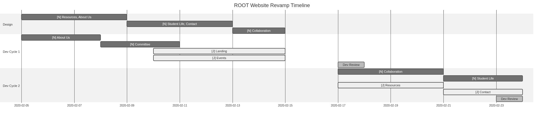 [](https://mermaid-js.github.io/mermaid-live-editor/#/edit/eyJjb2RlIjoiZ2FudHRcblx0dGl0bGUgUk9PVCBXZWJzaXRlIFJldmFtcCBUaW1lbGluZVxuXHRkYXRlRm9ybWF0ICBERC1NTS1ZWVlZXG5cdHNlY3Rpb24gRGVzaWduXG5cdFtOXSBSZXNvdXJjZXMsIEFib3V0IFVzICAgICAgICAgICA6IGExLCAwNS0wMi0yMDIwLCA0ZFxuXHRbTl0gU3R1ZGVudCBMaWZlLCBDb250YWN0ICAgICA6YTIsIGFmdGVyIGExLCA0ZFxuXHRbTl0gQ29sbGFib3JhdGlvbiAgICAgOmEzLCBhZnRlciBhMiwgMmRcblx0c2VjdGlvbiBEZXYgQ3ljbGUgMVxuXHRbTl0gQWJvdXQgVXMgICAgIDowNS0wMi0yMDIwICAsIDNkXG5cdFtOXSBDb21taXR0ZWUgICAgICA6IDNkXG5cdFtKXSBMYW5kaW5nICAgICA6YWN0aXZlLCAxMC0wMi0yMDIwLCA1ZFxuXHRbSl0gRXZlbnRzIFx0XHQ6YWN0aXZlLCAxMC0wMi0yMDIwLCA1ZFxuXHREZXYgUmV2aWV3XHQ6ZG9uZSwgMTctMDItMjAyMCwgMWRcblxuXHRzZWN0aW9uIERldiBDeWNsZSAyXG5cdFtOXSBDb2xsYWJvcmF0aW9uXHQ6MTctMDItMjAyMCwgNGRcblx0W05dIFN0dWRlbnQgTGlmZVx0OjNkXG5cdFtKXSBSZXNvdXJjZXNcdDphY3RpdmUsIDE3LTAyLTIwMjAsIDRkXG5cdFtKXVx0Q29udGFjdFx0XHQ6YWN0aXZlLCAzZFxuXHREZXYgUmV2aWV3XHRcdDpkb25lLCAyMy0wMi0yMDIwLCAxZFxuXHRcdFx0XHRcdCIsIm1lcm1haWQiOnsidGhlbWUiOiJuZXV0cmFsIn0sInVwZGF0ZUVkaXRvciI6ZmFsc2V9)