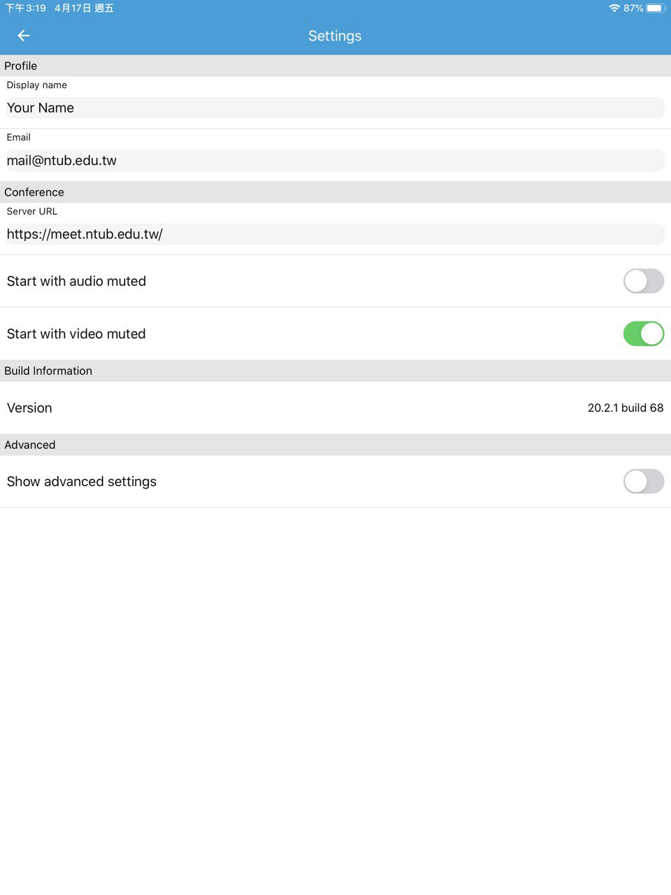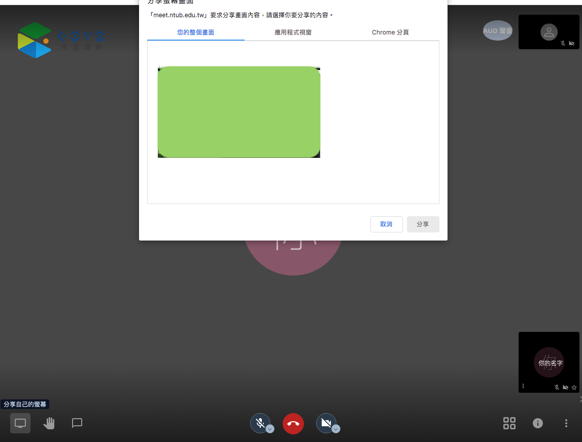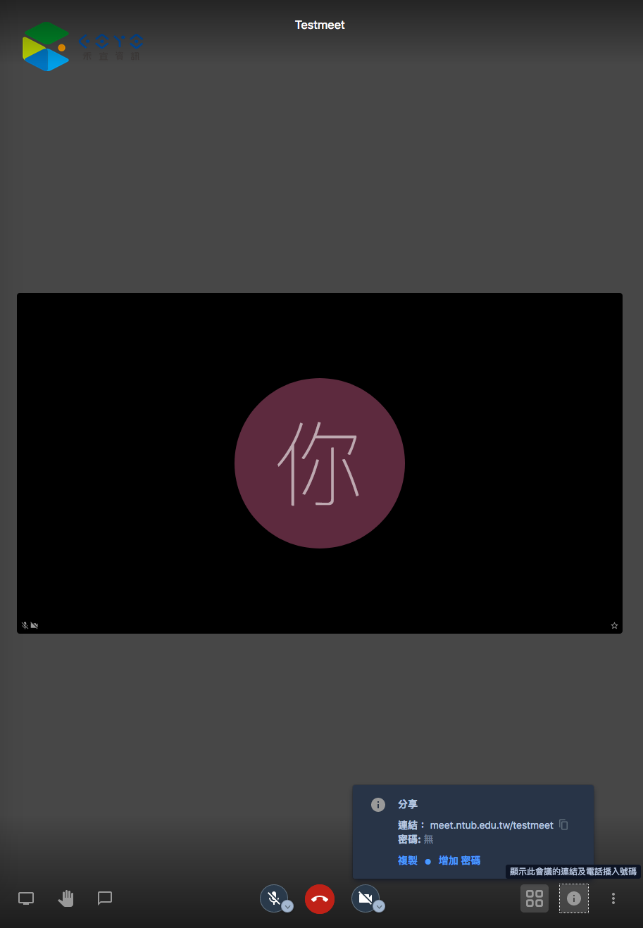 --- title: 國立臺北商業大學Meet 教學 tags: 教學 --- # 國立臺北商業大學線上 Meet ## 連結: https://meet.ntub.edu.tw/ ### App版(Jitsi Meet) - [Android App](https://play.google.com/store/apps/details?id=org.jitsi.meet) - [Android APK](https://f-droid.org/en/packages/org.jitsi.meet/) - [iOS App](https://apps.apple.com/us/app/jitsi-meet/id1165103905)  <!--  --> ## 發起或加入Meet前,首頁個人設定 ### 1. 點選右上角設置 ### 2. 點選裝置,檢查攝影機及麥克風`(每次開始Meet前檢查)` ### 3. 點選簡介,設定名字和email`(每次開始Meet前檢查)` ### 4. 點選更多,設定介面語言  <!--  --> ## 發起或加入Meet ### 在`啟動新的會議`下方輸入框輸入會議代碼 :::warning * 找不到會議代碼會建立新的會議室 * 如會議代碼存在則會加入會議 :::  <!--  --> ## 主持人設定密碼 :::danger 避免他人亂入會議室,請主持人務必設定會議室密碼 ::: ### 1. 點擊右下方分享按鈕 ### 2. 點擊增加密碼(輸入密碼後按下Enter,完成設定) ### 3. 點擊連結旁複製按鈕,複製連結 :::info 連結:meet.ntub.edu.tw/testmeet - https://meet.ntub.edu.tw使用`testmeet`加入會議室 - `https://meet.ntub.edu.tw/testmeet`直接加入會議室 - 手機平板App確認是否為Video模式,輸入`https://meet.ntub.edu.tw/testmeet`加入會議室 :::  <!--  --> ## 會議人員管理(主持人) ### 1. 切換頭像框顯示模式,顯示所有人員  <!--  --> ### 2. 點擊某位人員頭像框右上角設定按鈕 - `踢出`,強制退出會議室 - `Mute everyone else`,將所有參與者靜音,除了這個人  <!--  --> ## 常用功能 > 左下方功能列,由左至右 > :::warning 螢幕分享僅電腦版可以使用 ::: ### 1. 螢幕分享 ### 2. 舉手 ### 3. 文字訊息聊天  <!--  --> ## Meet會議室更多設定 :::success 頭像框右下角有星號代表是會議主持人 ::: :::warning 畫面出現延遲情況,可以試著更改**管理影像品質**至標準影像或更低 ::: :::danger 請勿使用**模糊我的背景畫面**,將會出現嚴重畫面延遲現象 ::: :::info 主持人可以使用**Mute everyone**來靜音所有人, 但是參與人還是可以自行解除靜音 :::  <!--  --> ## 手機平板App預設使用北商伺服器 :::success 設定完成後,之後只需要輸入會議代碼,不需輸入完整會議網址 ::: ### 點擊左上角選單 :::info 確定右上角為Video模式 :::  <!--  --> ### 點擊Settings  <!--  --> ### 設定Server URL :::info https://meet.ntub.edu.tw ::: - 設定Display Name - 設定Email - 設定Server URL  <!--  -->