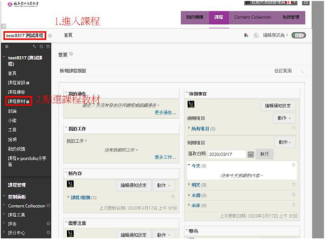 --- title: BlackBoard教學 tags: 教學 --- # BlackBoard數位學習管理教學 ## [前往 BlackBoard 頁面](https://bb.ntub.edu.tw) ## 一、放置投影片 操作步驟: 1.進入課程 2.左邊功能版「課程教材」 3.「建置內容」選擇「項目」 4.輸入名稱「如:chapter01投影片」→下方文字區塊可自行備註輸入「如:請同學於第一堂課前先行觀看投影片內容...等」 5.附件-附加檔案「5-1教材為第一次放入平台點選『瀏覽我的電腦』5-2若為之前放過的教材點選『瀏覽content collection』」 6.送出 --- 步驟畫面: 1. 進入課程 2. 左邊功能版「課程教材」  <!--  --> --- ## 二、放置影片檔 ## 三、連結youtube影音四、建置作業