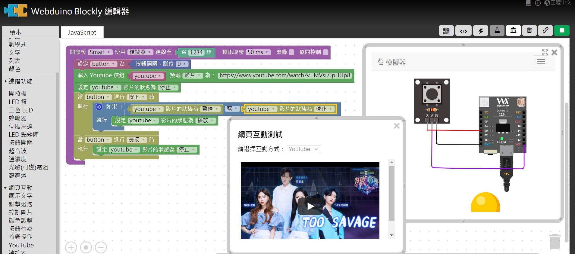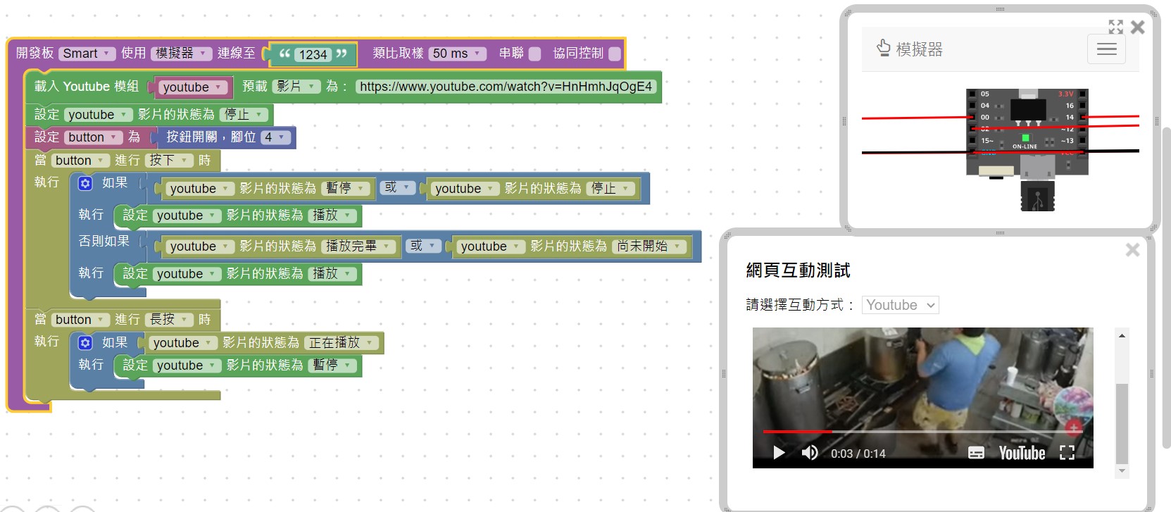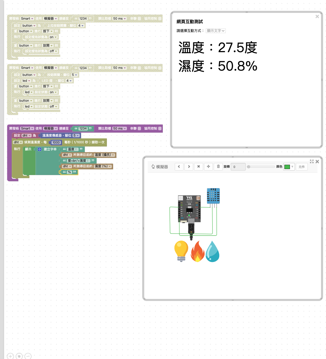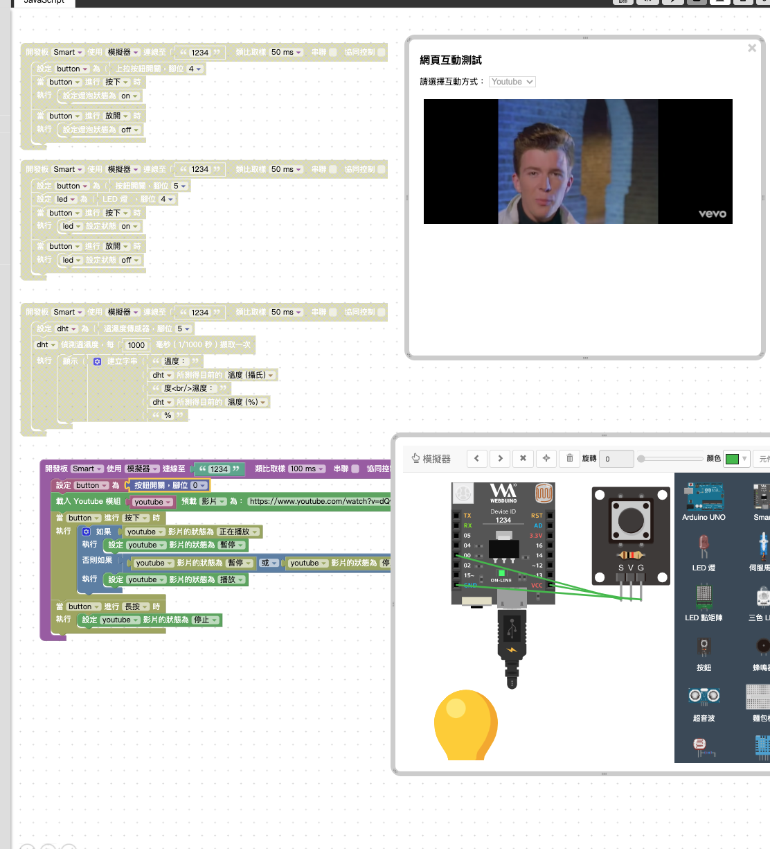--- title: 0605 AIOT 作業 tags: AIOT --- > [首頁](https://hackmd.io/@ntust-tech/AIOT_main) > [線上模擬器](https://simulatortrial.webduino.io/?lang=zh-tw) > [upload.cc](https://upload.cc/) # 0605 AIOT 作業 - 內建按鈕 - 外接按鈕 - 溫濕度顯示 - yt 播放 --- ### 徐儀翔 #### 內建按鈕  #### 外接按鈕  #### 溫濕度顯示  #### yt 播放  --- ### 葛世霆 https://simulatortrial.webduino.io/?lang=zh-tw&demo=demo-area-07#-MbQ47AQndGq07LPvxXE #### W1  #### W2  #### W3  #### W4  --- ### 劉蔡禧 #### 第一題  #### 第二題  #### 第三題 https://upload.cc/i1/2021/06/05/y3hOCb.png #### 第四題 https://upload.cc/i1/2021/06/05/iLlczn.png --- ### 陳柏儒 #### 第1題  #### 第2題  #### 第3題  #### 第4題  --- ### 謝青芳 #### 第一題  #### 第二題 [img]https://upload.cc/i1/2021/06/05/NaMDsv.png[/img] #### 第三題 [img]https://upload.cc/i1/2021/06/05/b9YrqO.png[/img] #### 第四題 [img]https://upload.cc/i1/2021/06/05/78HnP4.png[/img] --- ### 謝宜城 #### 第一題 上拉式按鈕  #### 第二題 下拉式按鈕 https://ibb.co/xJP4cSQ #### 第三題 溫溼度感測 https://ibb.co/Lhf40Pb #### 第四題 youtube播放 https://ibb.co/jLFd2j4 --- ### 李嘉雄 #### 第一題  https://simulatortrial.webduino.io/?lang=en&demo=demo-area-02#-MbPvgG9IJmriVpPdS2S #### 第二題  https://simulatortrial.webduino.io/?lang=en#-MbPzRT5MonzKN1FTT2F #### 第三題 https://simulatortrial.webduino.io/?lang=en&demo=demo-area-01#-MbQ1N5gaxfx_wNRVI5t #### 第四題 https://simulatortrial.webduino.io/?lang=en&demo=demo-area-07#-MbQ7dVBDt8WPXyiQqG8 --- ### 江豐毅 #### 第一題  #### 第二題  #### 第三題  #### 第四題  --- ### 李奇芷 #### Q1  #### Q2  #### Q3  #### Q4  --- ### 蔡譯漢 #### 第一題  #### 第二題 https://ibb.co/5jgMLbk #### 第三題 https://ibb.co/XyP5CqF #### 第四題 https://ibb.co/177KjDp --- ### 陸德宏 #### 第一題  #### 第二題 [img]https://upload.cc/i1/2021/06/05/LOmIlz.png[/img] #### 第三題 [img]https://upload.cc/i1/2021/06/05/YkvCoE.png[/img] #### 第四題 [img]https://upload.cc/i1/2021/06/05/JcknWS.png[/img] ---
