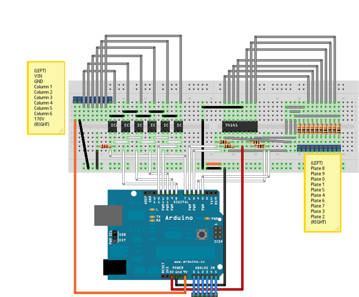 --- title: "Arduino + Nixie Tube" tags: hackpad --- # Arduino + Nixie Tube > [點此觀看原始內容](https://openlabtaipei.hackpad.tw/avOZFhP4GwM) Arduino + Nixie Tube [http://www.arduinix.com/](http://www.arduinix.com/) 數字真空管類型 | 類型 | 蘇聯 | 中國 | 其他 | | --- | --- | --- | --- | | 直立管 | IN-8 IN-14 IN-16 | QS16-12 QS18-12(類IN-14) | NL-874(倒立) | | 平面管 | IN-2 IN-4(超大) IN-12 IN-17 | QS16-1 QS30-1(SZ-8,SZ1-1) QS27-1(類IN-12) | | | 符號管 | | QS30-53(+-x/) | | 組成: - [ ] Arduino - [ ] 9~12V DC to 170V~200V DC - [ ] Nixie tube驅動方式 - [ ] RTC module(斷電後繼續供電給IC累計時間) 常見驅動方式: 1. SN74141(K1551D1) 2. 74HC595 供電: 1. DC170V~200V  RTC (DS1307)  電路收集: 1. 74141 + TLP621*6 [http://fritzing.org/projects/nixi-tube-control-driver-shield-for-arduino](http://fritzing.org/projects/nixi-tube-control-driver-shield-for-arduino)   [CODE](http://fritzing.org/media/fritzing-repo/projects/n/nixi-tube-control-driver-shield-for-arduino/code/nixi_test1.pde) 2 74141\*4+74HC595\*2 [http://forum.arduino.cc/index.php/topic,126281.0.html](http://forum.arduino.cc/index.php/topic,126281.0.html) 3.