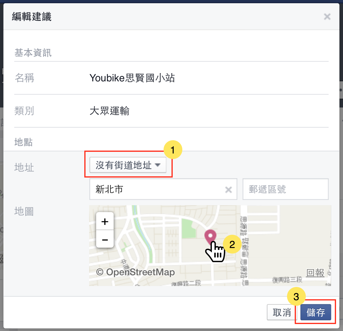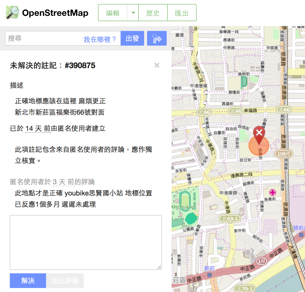 --- title: "來自臉書的Note" tags: hackpad --- # 來自臉書的Note > [點此觀看原始內容](https://osmtw.hackpad.tw/r0FK9rTkjoI) 來自臉書的Note ## 為什麼會有來自臉書的Note? 目前臉書部分地圖採用 OSM (OpenStreetMap)作為底圖,而且還增加了修正圖資用的回報按鈕(下圖)。因為只要按下「開啟」按鈕就會打開 OSM 新增註記(note)的頁面,所以註記的數量增長迅速。  ## 那會出什麼錯? ### 誤以為 OSM 定位錯誤 如果臉書上的定位本身就錯了,那臉書地圖上的定位圖示就會放在錯的位置。 #### 舉個例子 「Youbike思賢國小站」[https://www.facebook.com/pages/Youbike思賢國小站/1614970395417506](https://www.facebook.com/pages/Youbike思賢國小站/1614970395417506) 來看下圖,目前(20150718)的定位點是在紅色圖示的位置,但這是錯的,正確的定位點約略在綠色圖示的位置。  #### 跟 OSM 啥關係? 然而實際上,臉書並不是依 OSM 的定位來顯示的,而是把 OSM 作為底圖使用,然後根據臉書資料庫內的位置標示定位圖示,但大多數臉書的使用者並沒有這個概念,所以就會直接回報到 OSM 上。(見下圖或 OSM 註記: [https://www.openstreetmap.org/note/390875#map=19/25.04696/121.45851](https://www.openstreetmap.org/note/390875#map=19/25.04696/121.45851))  ## 正確的回報方式? 如果要修改臉書定位,必須透過臉書本身的「資訊編輯建議」功能。(見下圖)  點擊「資訊編輯建議」後: 1. 在地址欄位選擇「沒有街道地址」 2. 在地圖框中把紅色定位圖示「拖拉放」到 正確的位置 3. 按下「儲存」  然後就默默等待臉書更新資料吧。