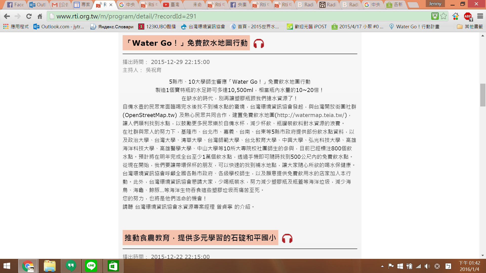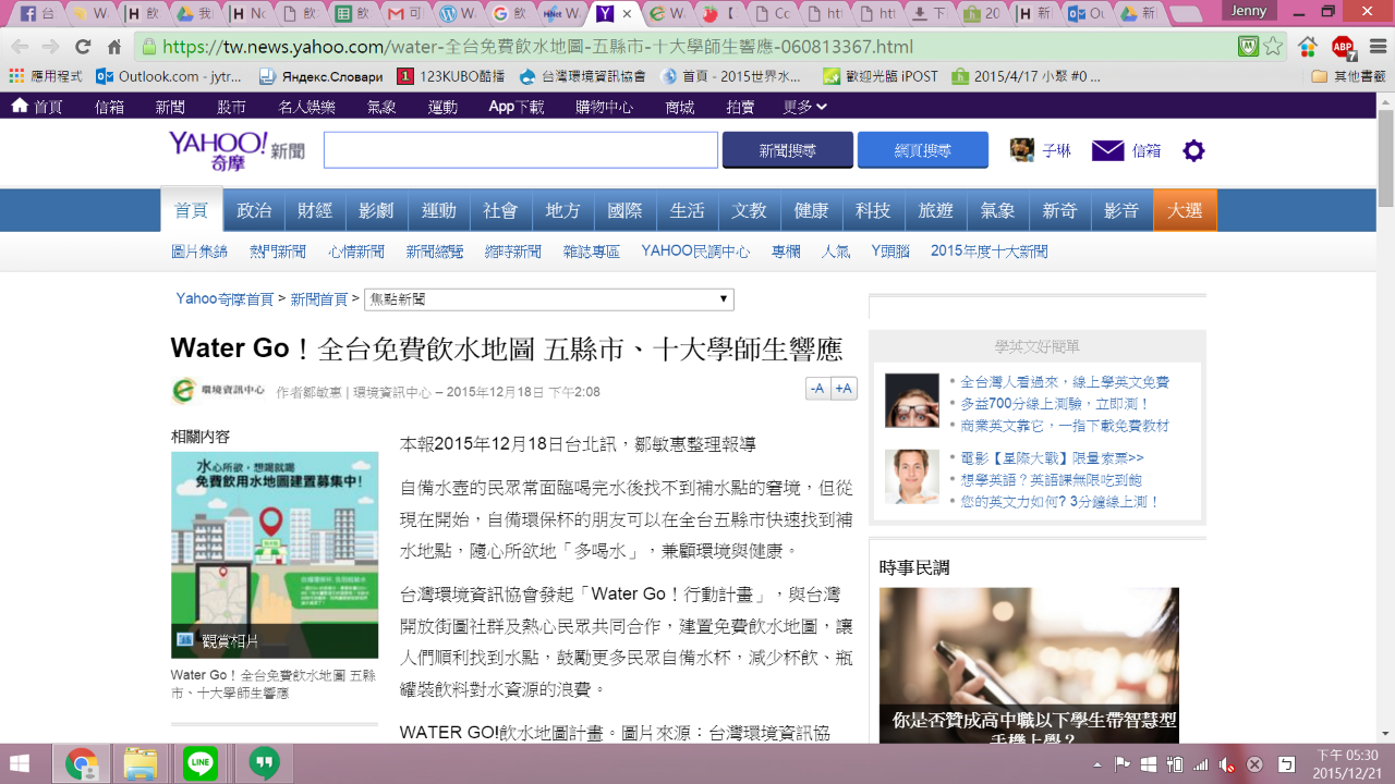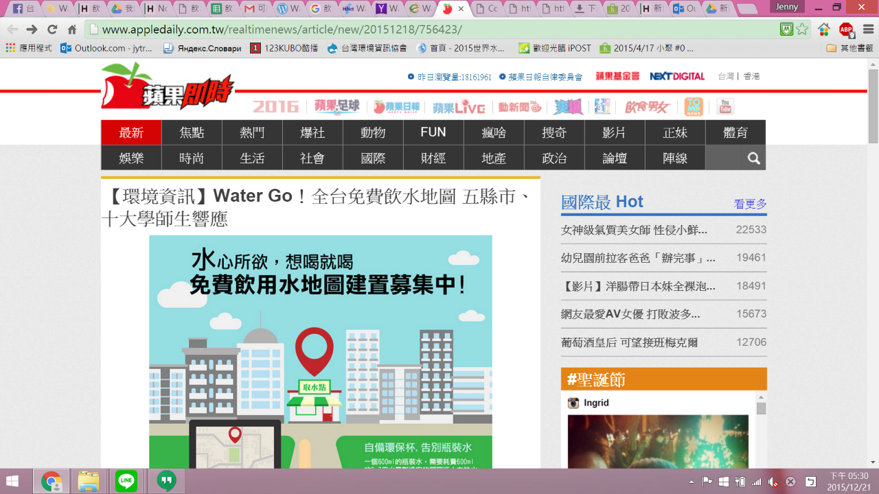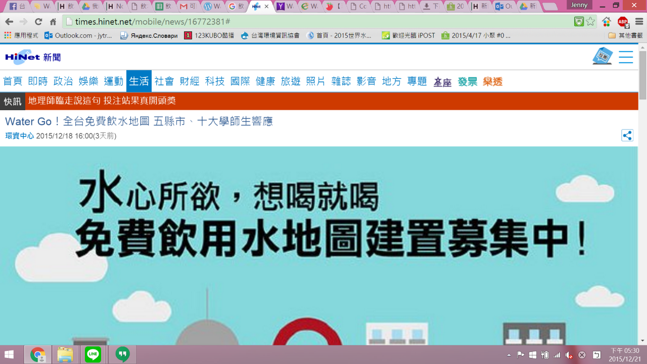 --- title: "媒體露出與新聞稿內容" tags: 飲水地圖,hackpad --- # 媒體露出與新聞稿內容 > [點此觀看原始內容](https://osmtw.hackpad.tw/qDDmcp2EsQv) 媒體露出與新聞稿內容 一、環境資訊中心 20151218 Water Go!全台免費飲水地圖 五縣市、十大學師生響應 鄒敏惠整理報導 [http://e-info.org.tw/node/112249](http://e-info.org.tw/node/112249) 二、hinet 新聞 生活(轉環資中心)20151218 Water Go!全台免費飲水地圖 五縣市、十大學師生響應 [http://times.hinet.net/mobile/news/16772381#](http://times.hinet.net/mobile/news/16772381#)  三、奇摩新聞(轉環資中心)20151218 Water Go!全台免費飲水地圖 五縣市、十大學師生響應 [https://tw.news.yahoo.com/water-%E5%85%A8%E5%8F%B0%E5%85%8D%E8%B2%BB%E9%A3%B2%E6%B0%B4%E5%9C%B0%E5%9C%96-%E4%BA%94%E7%B8%A3%E5%B8%82-%E5%8D%81%E5%A4%A7%E5%AD%B8%E5%B8%AB%E7%94%9F%E9%9F%BF%E6%87%89-060813367.html](https://tw.news.yahoo.com/water-%E5%85%A8%E5%8F%B0%E5%85%8D%E8%B2%BB%E9%A3%B2%E6%B0%B4%E5%9C%B0%E5%9C%96-%E4%BA%94%E7%B8%A3%E5%B8%82-%E5%8D%81%E5%A4%A7%E5%AD%B8%E5%B8%AB%E7%94%9F%E9%9F%BF%E6%87%89-060813367.html)  四、蘋果即時(轉環資中心)20151218【環境資訊】Water Go!全台免費飲水地圖 五縣市、十大學師生響應 [http://www.appledaily.com.tw/realtimenews/article/new/20151218/756423/](http://www.appledaily.com.tw/realtimenews/article/new/20151218/756423/)  五、中央社 生活 20151224 少喝瓶裝水自備杯 水地圖取水超方便 中央社記者魏紜鈴 [http://appweb.cna.com.tw/webm/menu/ahel/201512240026.aspx](http://appweb.cna.com.tw/webm/menu/ahel/201512240026.aspx) 六、ETtoday 生活 20151224 出門帶環保杯就好!「水地圖」告訴你附近哪能補水 生活中心/綜合報導 [http://www.ettoday.net/news/20151224/618631.htm](http://www.ettoday.net/news/20151224/618631.htm) 聯合 [http://udn.com/news/story/9/1397839-%E5%B0%91%E5%96%9D%E7%93%B6%E8%A3%9D%E6%B0%B4%E8%87%AA%E5%82%99%E6%9D%AF-%E6%B0%B4%E5%9C%B0%E5%9C%96%E5%8F%96%E6%B0%B4%E8%B6%85%E6%96%B9%E4%BE%BF%22](http://udn.com/news/story/9/1397839-%E5%B0%91%E5%96%9D%E7%93%B6%E8%A3%9D%E6%B0%B4%E8%87%AA%E5%82%99%E6%9D%AF-%E6%B0%B4%E5%9C%B0%E5%9C%96%E5%8F%96%E6%B0%B4%E8%B6%85%E6%96%B9%E4%BE%BF%22) 七、自由 生活新聞 20151224 少喝瓶裝水!自備環保杯上哪補水 「水地圖」告訴你 即時新聞/綜合報導 [http://m.ltn.com.tw/news/life/breakingnews/1550031](http://m.ltn.com.tw/news/life/breakingnews/1550031) 八、關鍵評論網 社會 生活 20151224 自備水壺減少垃圾 環團推「飲水地圖」助你找到全台飲水機 Shih Yuan [http://www.thenewslens.com/post/262566/](http://www.thenewslens.com/post/262566/) 九、新浪(轉中央社內容)20151224 飲水地圖可查500公尺內飲水點 [http://m.news.sina.com.tw/article/20151224/15822629.html](http://m.news.sina.com.tw/article/20151224/15822629.html) 十、一零一傳媒(轉中央社內容)20151224 提倡水源節省 發起行動飲水點 [http://news.101media.com.tw/news/18755](http://news.101media.com.tw/news/18755) 十一、美麗島電子報(轉中央社內容)20151224 少喝瓶裝水自備杯 水地圖取水超方便 [http://www.my-formosa.com/DOC_93358.htm](http://www.my-formosa.com/DOC_93358.htm) 十二、政大之聲實習廣播電台 20151225 全台免費飲水地圖 政大師生響應 政大之聲記者李貞誼的採訪報導 [http://www.vnccu.nccu.edu.tw/zh_tw/news/%E5%85%A8%E5%8F%B0%E5%85%8D%E8%B2%BB%E9%A3%B2%E6%B0%B4%E5%9C%B0%E5%9C%96-%E6%94%BF%E5%A4%A7%E5%B8%AB%E7%94%9F%E9%9F%BF%E6%87%89-88582258](http://www.vnccu.nccu.edu.tw/zh_tw/news/%E5%85%A8%E5%8F%B0%E5%85%8D%E8%B2%BB%E9%A3%B2%E6%B0%B4%E5%9C%B0%E5%9C%96-%E6%94%BF%E5%A4%A7%E5%B8%AB%E7%94%9F%E9%9F%BF%E6%87%89-88582258) 十三、公共電視 生活財經 20151225 全台免費飲水點 環團建置"水地圖" 記者 黃立偉 陳立峰 [http://news.pts.org.tw/article/313394](http://news.pts.org.tw/article/313394) 影片:[https://www.youtube.com/watch?v=C_JYQph9dzY](https://www.youtube.com/watch?v=C_JYQph9dzY) 十四、台海网 20151225 台湾推出“免费饮水地图”,鼓励民众自备环保水杯 海峡导报记者 刘强 [http://www.taihainet.com/news/twnews/twsh/2015-12-25/1620861.html](http://www.taihainet.com/news/twnews/twsh/2015-12-25/1620861.html) 十五、豫台有约网(轉台海网內容)20151225 台湾推出“免费饮水地图”,鼓励民众自备环保水杯 [http://www.twhn.com/benwangkuaixun/taiwanxinwen/2015-12-25/62356.html](http://www.twhn.com/benwangkuaixun/taiwanxinwen/2015-12-25/62356.html) 十六、PChome (轉中央社內容) 20151224 少喝瓶裝水自備杯 水地圖取水超方便 [http://news.pchome.com.tw/living/cna/20151224/index-14509173744551618009.html](http://news.pchome.com.tw/living/cna/20151224/index-14509173744551618009.html) 十七、中央廣播電訪 20151229 [http://radio.rti.org.tw/program/detail/?recordId=291](http://radio.rti.org.tw/program/detail/?recordId=291)  (不知道怎麼下載廣播檔案) 十八、環境資訊中心電子報 [https://e-info.org.tw/node/217066](https://e-info.org.tw/node/217066) \-\-\- 新聞稿pdf檔連結 [https://drive.google.com/folderview?id=0B_smsM7Qz8aEckltcDZUVTQ2cjA&usp=sharing](https://drive.google.com/folderview?id=0B_smsM7Qz8aEckltcDZUVTQ2cjA&usp=sharing)