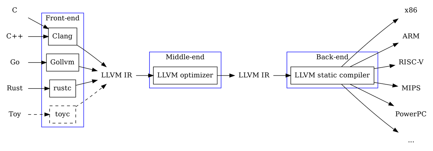 Everybody knows how to write `helloworld.c` and compile it with `gcc` which was known **GNU C Compiler** but is renamed as **[GNU Compiler Collection](https://zh.wikipedia.org/wiki/GCC)** currently. From the time Linux was developed, compiler has played a core role in software ecosystem and it is considered as even more important componant in the future.