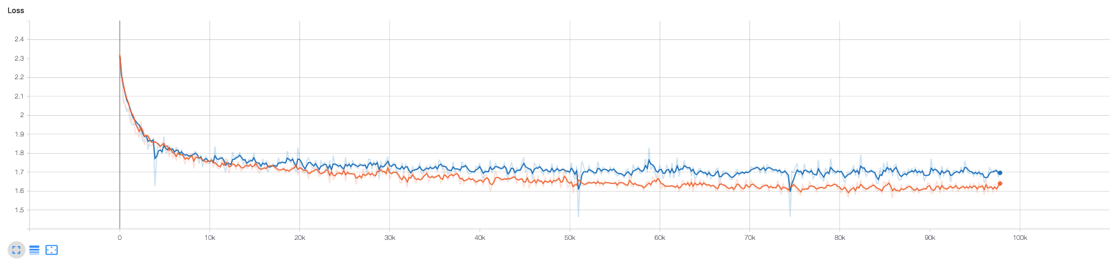 Figure 1: Tensorboard Cross-Entropy Loss vs Number of Training Iterations (blue is validation loss; orange is training loss).