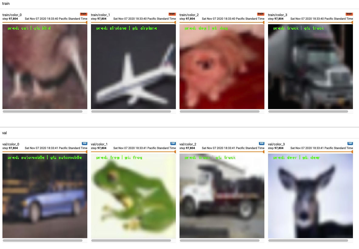 Figure 6: Some predictions visualized by tensorboard for the unsupervised training. You can see that the predictions match the ground-truth. However, the two examples on the left are both frogs, but the model labeled the ground-truth for one from as airplane and the other as cat, showing how the model is not learning the best clustering.