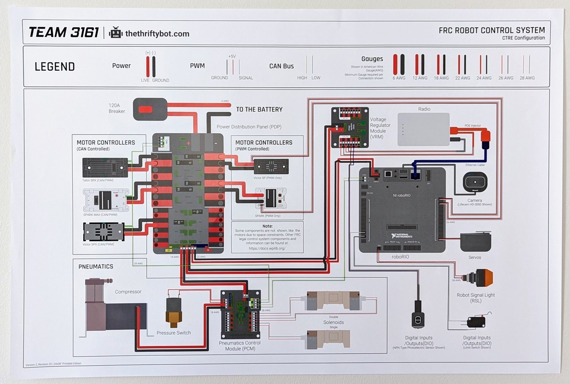 ## 簡介: 如果結構是為機台創造身軀,那配電就是在賦予機台生命 ## 課程一:各部件配置 ### step1: 組裝開關&PDP介紹   1. 先用電源線接頭將電線與接頭壓接固定 2. 將電線用M6螺絲與墊片固定 3. 最後將保護板裝上 ### step2: 保險絲介紹 在FRC的保險絲有分為三種 分別為20AMP、30AMP、40AMP 20AMP:燈號  30AMP:其他小馬達 40AMP:馬達控制器  ### step3: 安裝保險絲 1. 選擇適合的保險絲 2. 以電源線為上方並讓文字擺正,將其插入PDP中 ## 課程二: 網路訊號配置 ### roboRIO的介紹  ### step1: 將VRM、roboRIO連接PDP 1. 將電線剝皮,使銅線露出或使用Ferrules的壓接接頭將電線壓接 2. 分別用一字起將白色按鈕壓下,放入電線  ### step2: 安裝訊號線(杜邦線) 1. 將電線剝皮,使銅線露出或使用Ferrules的壓接接頭將電線壓接 2. 找到對應的孔,分別用一字起子將白色按鈕壓下,放入電線 3. CAN線是串連起來的,由roboRIO連接到馬達控制器上,再連接到VRM上,最後接回PDP ### step3: 網路機(WIFI機) 1. 提供機器人網路通訊 2. 可連接至筆記型電腦 3. 橘色網路線接到WIFI機的孔,另一端接到連接一般網路線 4. 橘色供電線要接到VRM的12v/2A的輸出口  ### step4: 燈號判別 1.STAT 和COMM會閃同樣的燈號  | 燈號顏色|解釋| | -------- | -------- | | 快閃綠色 | 機器人以連線且可以操控 | | 慢閃綠色 | 機器人以連線待命中 | | 閃橘燈 | 機器人有連線但發生錯誤| | 閃紅燈 | 沒有連接訊號線 | | 沒亮 | 沒有電源 | ## 課程三: PWM線路配置 ### step1-1: VRM介紹  1. 相對應的電子硬體要供應相對應的電流、電壓 2. 電源供應要接到PDP的20AMP 3. 使用Ferrules接頭電線壓接或將剝皮後的銅線插入 ### step1-2: 燈號判別 | 燈號顏色|解釋| | -------- | -------- | | 12V、5V亮 | 通電 | | 12V、5V暗 | 斷電 | ### **注意事項** VRM上沒有任何保險措施,所以在開電前務必先檢查是否接到正確的電壓及電流,以免導致其他裝置損壞 馬達控制器(SRX) ### step2-1: 馬達控制器概要 SRX是馬達控制器,可以控制一些比較基礎的馬達是775pro或是CIM馬達,因為這些馬達沒有自帶內建訊號,所以需要靠馬達控制器來控制他們,另外如果要使用encoder來記錄轉動圈數,也是會連接到Talon SRX。 ### step2-2: 各馬達控制器種類 & 連接方式 1. VICTOR  1.馬達要接白、綠色的線;PDP要接紅、黑色的線 2.如果要用壓接接頭,請使用安德森接頭或10~12AWG接頭 2. Talon  1.馬達要接白、綠色的線;PDP要接紅、黑色的線 2.如果要用壓接接頭,請使用安德森接頭或10~12AWG接頭 3. Spark Max  1.馬達要接A跟B;PDP要接正極跟負極 2.如果要用壓接接頭,請使用安德森接頭或10~12AWG接頭 **備註:這三種馬達控制器基本上功能都一樣,但Spark Max多了與Neo連接的功能,其餘馬達控制器連接NEO無法使其有正常功能** ### step2-3: PWM線路配置(不含氣動系統) 概念: 1. PDP先連至VRM 2.  ### step2-4: 顯示燈號 1. status | 顏色 | 解釋 | | -------- | -------- | | 沒亮 | 沒有供電 | | 綠燈 | 正常運作 | | 橘燈 | 待機狀態 | | 紅燈 | 沒有偵測到訊號線 | 2. 即停(B/C) | 顏色 | 解釋 | | -------- | -------- | | 沒亮 | 滑行模式 | | 紅燈 | 即停模式 | ## 課程四: CAN線路配置&PCM氣壓系統 ### 一、概要 PCM是一個控制機器人氣動系統的裝置,包括控制空壓機打氣、電磁閥開關等是機台重要的系統之一。  ### 二、PCM基礎配電  ### 三、PCM電源與訊號線 1. 將接頭與配電盤連接(PDP的20AMP) 2. 訊號線與其他馬達控制器串聯 ### 四、電磁閥  1. 電池有分12V和24V,配上PCM時請注意是否符合其電壓 2. 電磁閥的訊號線不得與一般訊號線(CAN)線串聯,其應該要接上相對應的訊號孔才行 ### 五、洩壓閥  1. 由三個部分組成保險裝置、氣壓表、洩壓閥(由左至右) 2. 安裝順序一定要依照此順序擺放 ### 六、空壓機  1. 空壓機電源線要在頭尾套上熱縮套管來保護電線 2. 空壓機要接上三向頭後在接上M6螺絲或是1/4螺絲與墊片鎖好 3. 所有氣動的連結點都必須用止洩帶捆好並用板手鎖緊 ### 七、調壓閥  1. 機器人有規定的壓力限制,所以我們需要調壓閥來幫我們調整氣瓶內壓力 2. 調壓閥要調整時必須拉開調整扭,旋轉後調整好後要把旋轉扭壓進去固定 ### 八、燈號 1. Compressor LED | 燈號顏色|解釋| | -------- | -------- | | 綠燈 | 正常運作 | | 紅燈 | 偵測錯誤 | 2. Status LED | 顏色 | 狀態 |解釋 | | -------- | -------- | -------- | | 紅 | 固定 | 空壓機故障 | | 紅 | 閃爍 | 空壓機異常或CAN線異常或電池閥訊號線異常 | | 黃 | 閃爍 | 偵測錯誤 | | 綠 | 慢閃 | 待機中 | | 綠 | 快閃 | 正常運作 | 3. Robot Signal Light | 燈號 | 解釋 | | -------- | -------- | | 長亮 | 機器人待機中 | | 閃爍 | 機器人連線正常運作 | | 沒亮 | 機器人關機 |  ## 課程七:配電&機臺運行安全事項  ### 一、電源供應  1. 機器人電池供電為12V/18A 2. 在連接到電池上時要將螺絲與螺帽鎖緊並纏上電火布 3. 連接電池時要將安德森與開關上的安德森接好 4. 使用一字起子等工具將配電盤撥片打開、拆解固定束帶時,需注意其尖銳處,必免受傷 5. VRM的電源供應處為20A,若電線安裝錯誤會使其有燒壞風險 6. 若電線塑膠包膜過長可用撥線鉗撥掉少許,方便電線安裝 7. VRM電源供應要接到PDP的20AMP 8. 電池引線在壓接後須套上熱縮套管 9. 電線正極為紅色,負極或地線為黑色 10. roboRIO通過輸入電源端口連接到PDP,勿將roboRIO直接連接到機器人電池 11. PDP總電源接線用M6螺絲與彈簧墊片鎖住固定 ### 二、訊號線連接  1. 將負極(黑色)