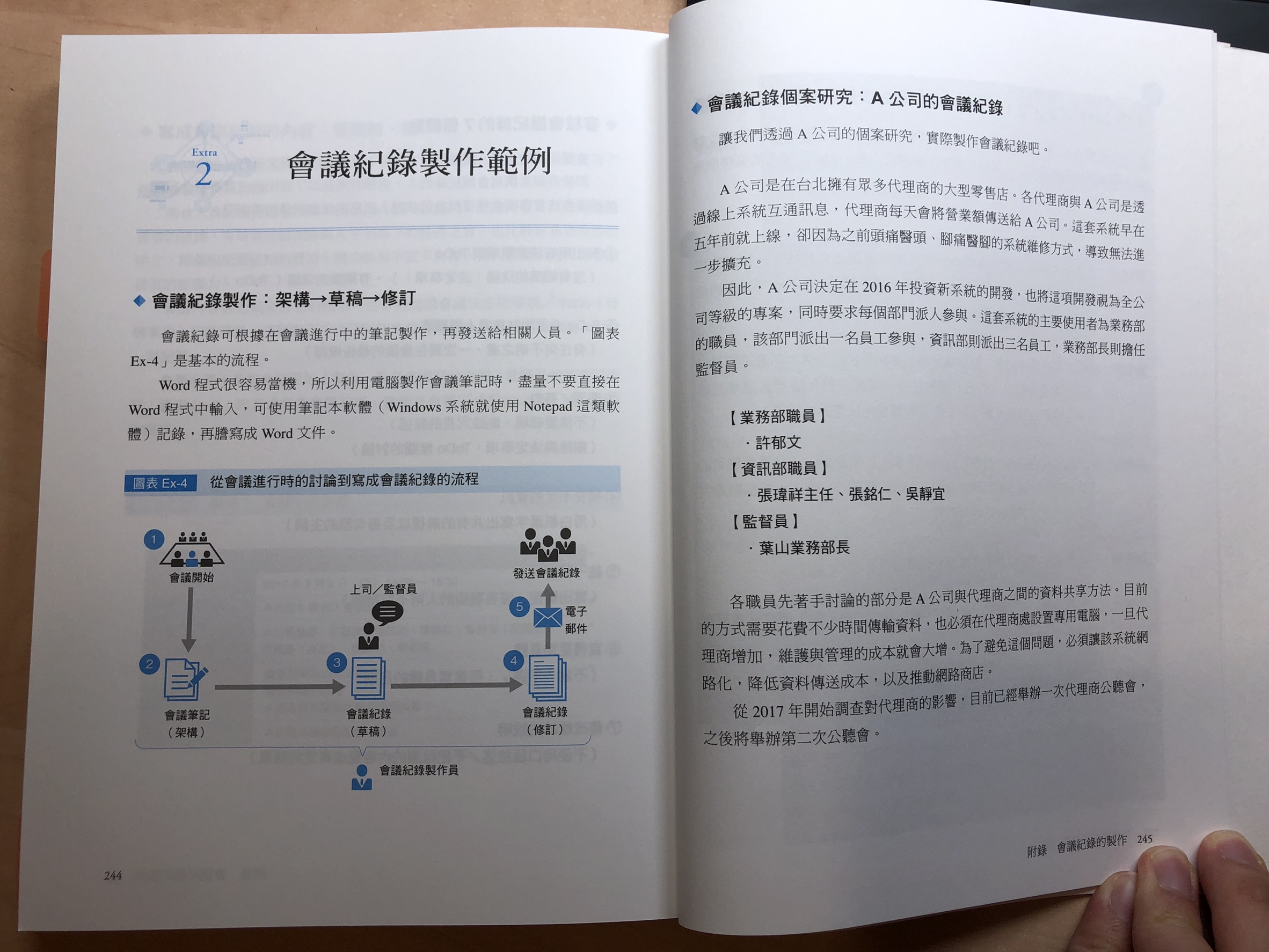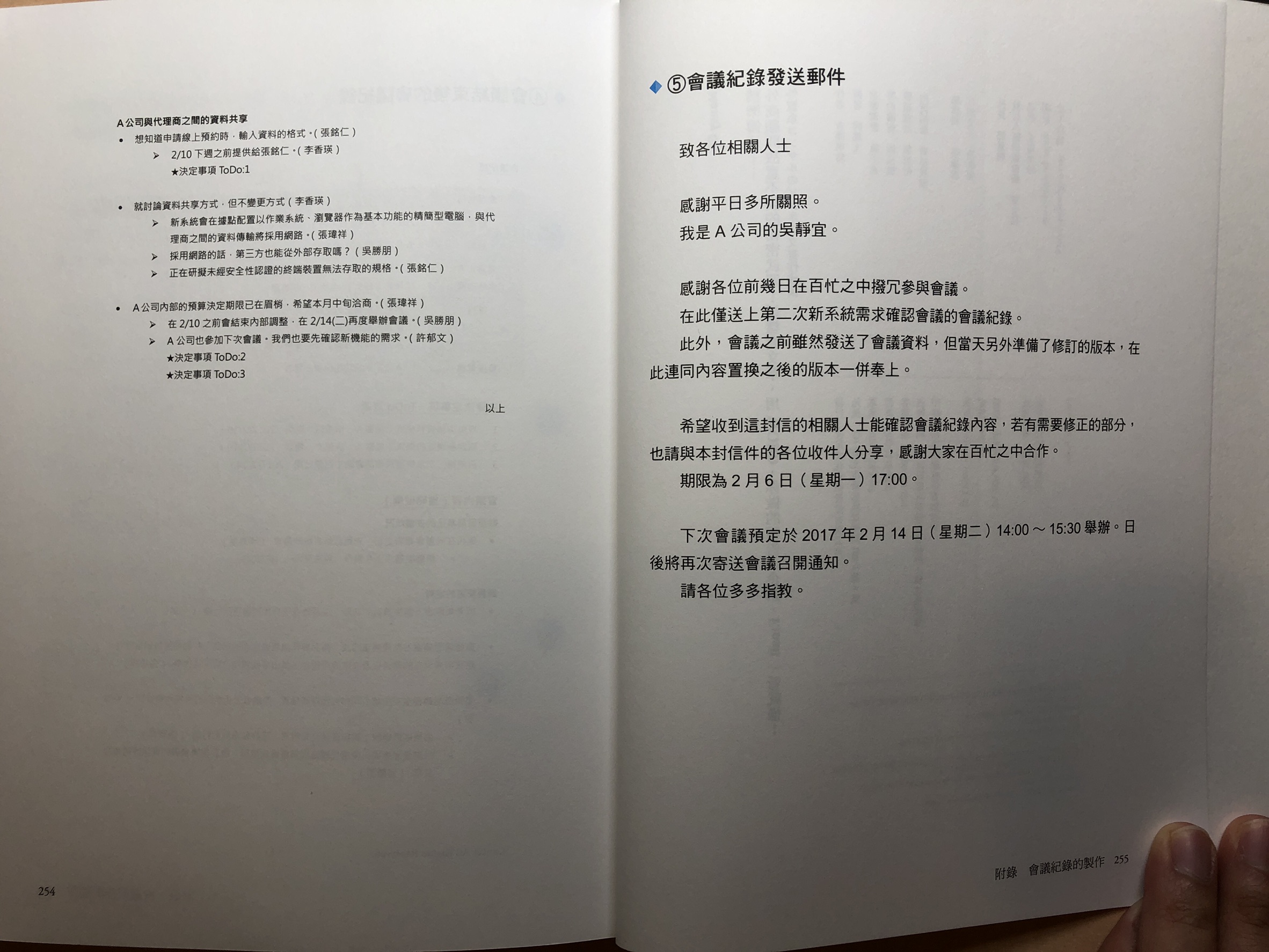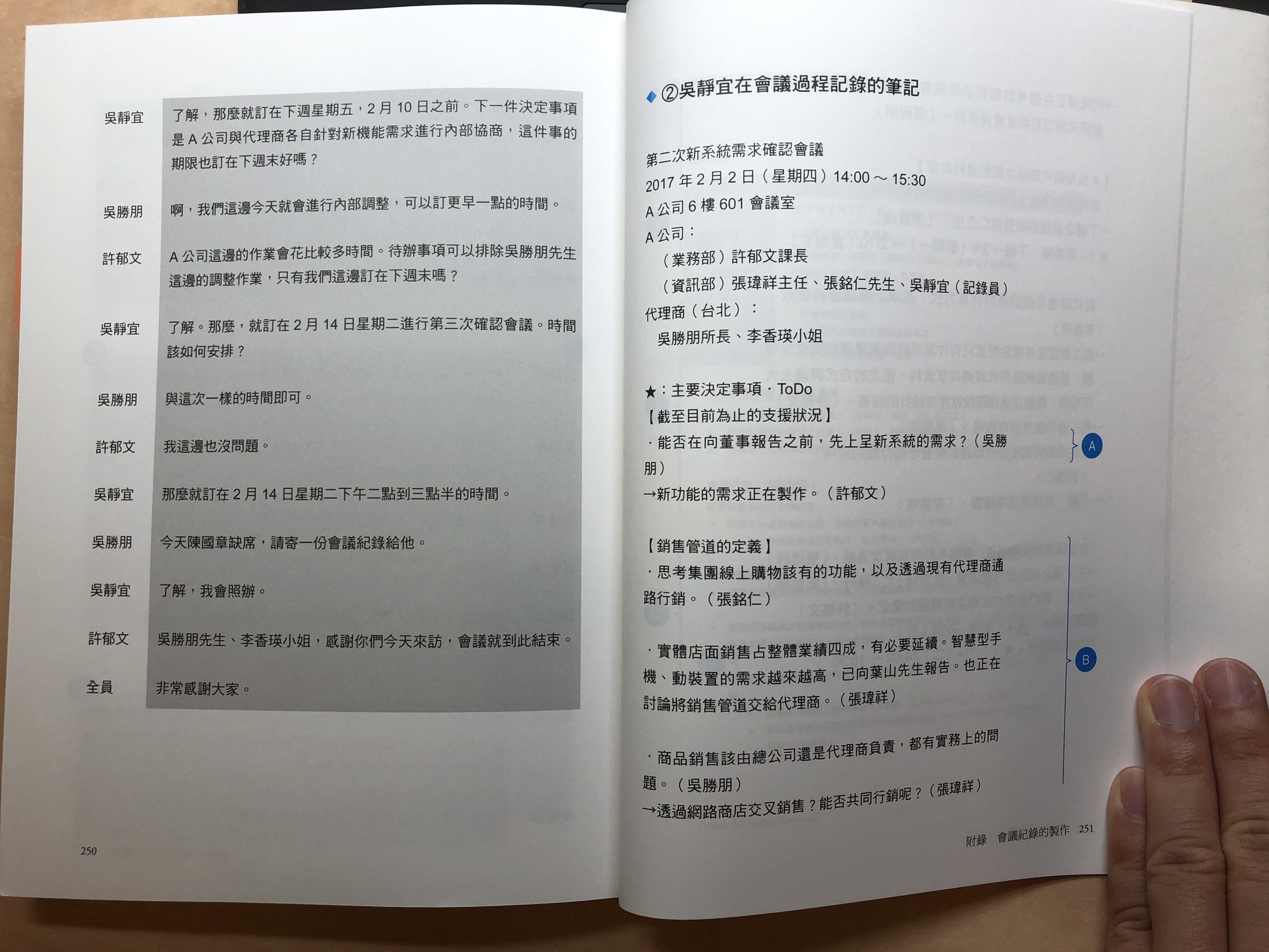 # 做會議紀錄的方法 9. 教學素材 -  -  -  -  -  -  10. 教學架構與整理 - **[[會議記錄]]架構流程** - **架構 -> 草稿 -> 修訂** - 架構可以在會議開始前,事先根據會議形式擬出初稿。 - 草稿可以先給「**上司**」看過。 - 修訂完的會議記錄在得到上司「**允許**」下可以發給所有與會者,為所有人創造最大價值。 -  - **一、架構** - **活動目的**(以吉祥樂學-活動記錄表為例) - 可以補充會議目的 - 可以補充會議討論議題 - **人**: - 原始:研發處曾玟瑄、李哲維(攝影紀錄)、卓真儀、國企系六位學生-林于菁、蔡存旻、蔡奕芃、郭昱思、謝珠華、王雯歆 - 可修正之處 1:**將每個人職稱與活動中角色打下,EX: 卓真儀。** - 可修正之處 2:**並且在徵得當事人同意後,在會議紀錄最下方備註處,打下重要角色的聯繫方式(電話,Email),EX: 研發處曾玟瑄,會議記錄人卓真儀。** - **事**: - 原始:開幕相見歡+運動操 - 可修正之處 1:**活動目的可以也事先打下來。** - 可修正之處 2:**若是會議型會議記錄,須事先寫下討論議題。事後若有新增可以在草稿處增添。若是事先擬的討論議題當次會議沒討論到也請在草稿標註。(範例如圖)** -  - **時**: - 原始:109年 10 月 27 日(星期二) 09 : 30 ~ 12 : 00 - 可修正之處:沒有可修正之處 - **地**: - 南埔社區 - 可修正之處:沒有可修正之處 - **物**: - 原始:無 - 可修正之處 1:**或許可以事先寫下當天主要會用到的道具,物品,設備。** - 可修正之處 2:**事先需要備齊印出 / 或者寄出給大家參考的檔案 / 文件也請寫在這。** - **二、草稿**(還沒給長官看過的會議記錄) - **會議類型的會議記錄草稿** - 會議當下內容要打下聽到得每個人說的「**重點關鍵字**」 - 1. 日期。 - 2. 問句。 - 3. 幾個人對話討論後的結論。 - 註:如果來不及打可以先打以上 3 點關鍵字,但重點是要記錄下每句發言,因為你不知道哪句話長官覺得是重點,可以整個對話草稿給長官讓他挑選重點,你再後續擷取中修訂。 - **記得要給長官確認** - 範例圖片  - **草稿最後寫完給長官看之前的必須要有的「重點」(如以上範例圖片)** - 1. TO 的結論 - 2. 必須寫下負責人 - 3. 還有時間 - 三、**修訂** (根據長官回饋確實修正擷取重點) **版本並且發送給會議相關者的信件內容**(會議記錄放在附件內) - **簡短總結(如下圖):** - 1. 我是誰 - 2. 發這封信的目的 - **簡短摘要:** - 這次結論 - 1. 決定 TODO 事項「負責人」和「時限」 - 2. 下次會議時間(需要參與下次會議的人) - **索取回饋**:若有會議參與者認為有意思上錯誤希望修正,敬請回饋。