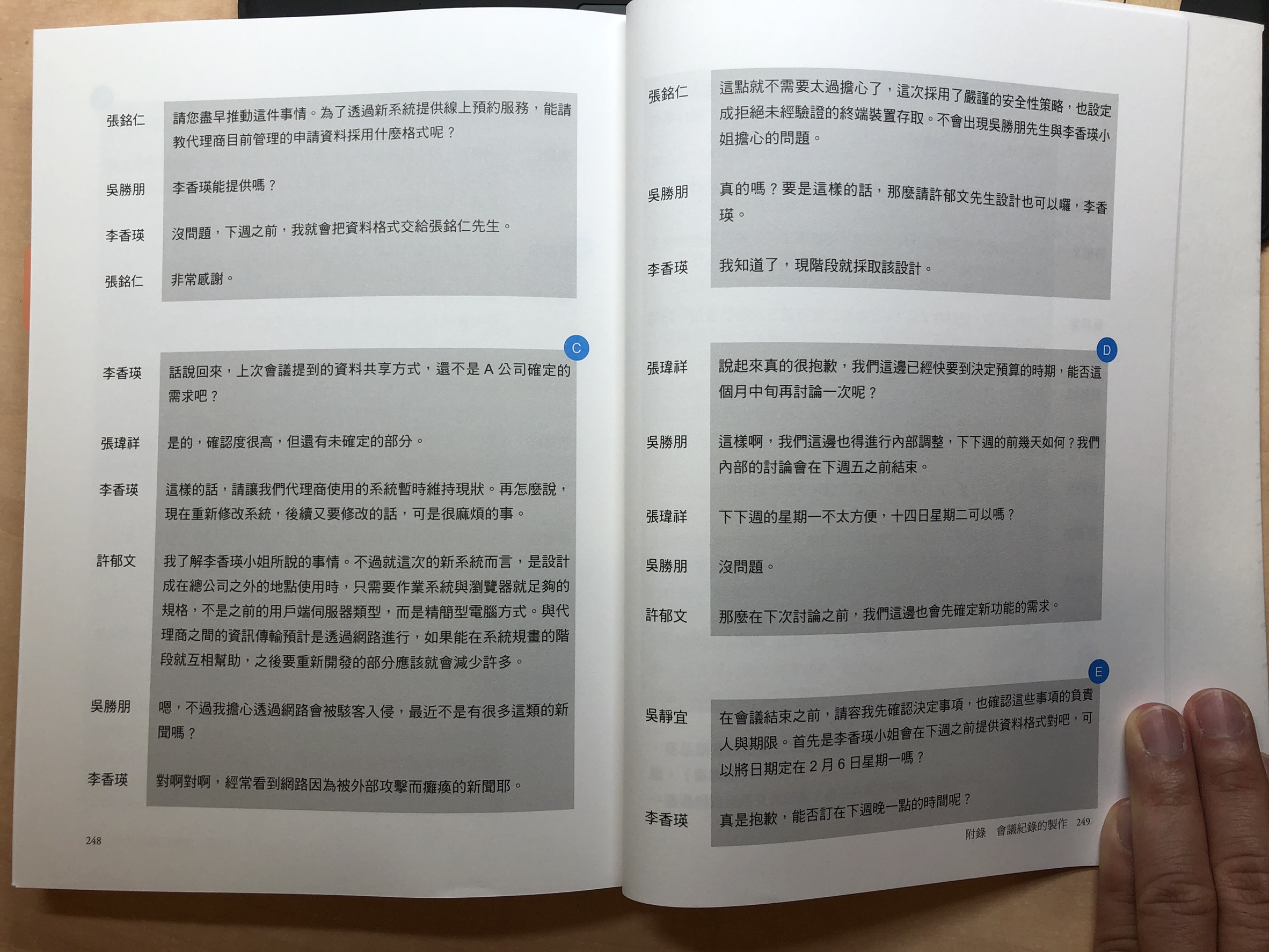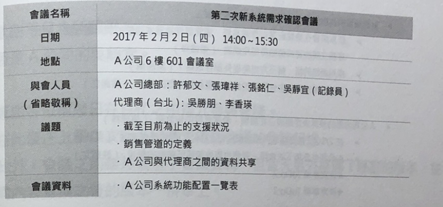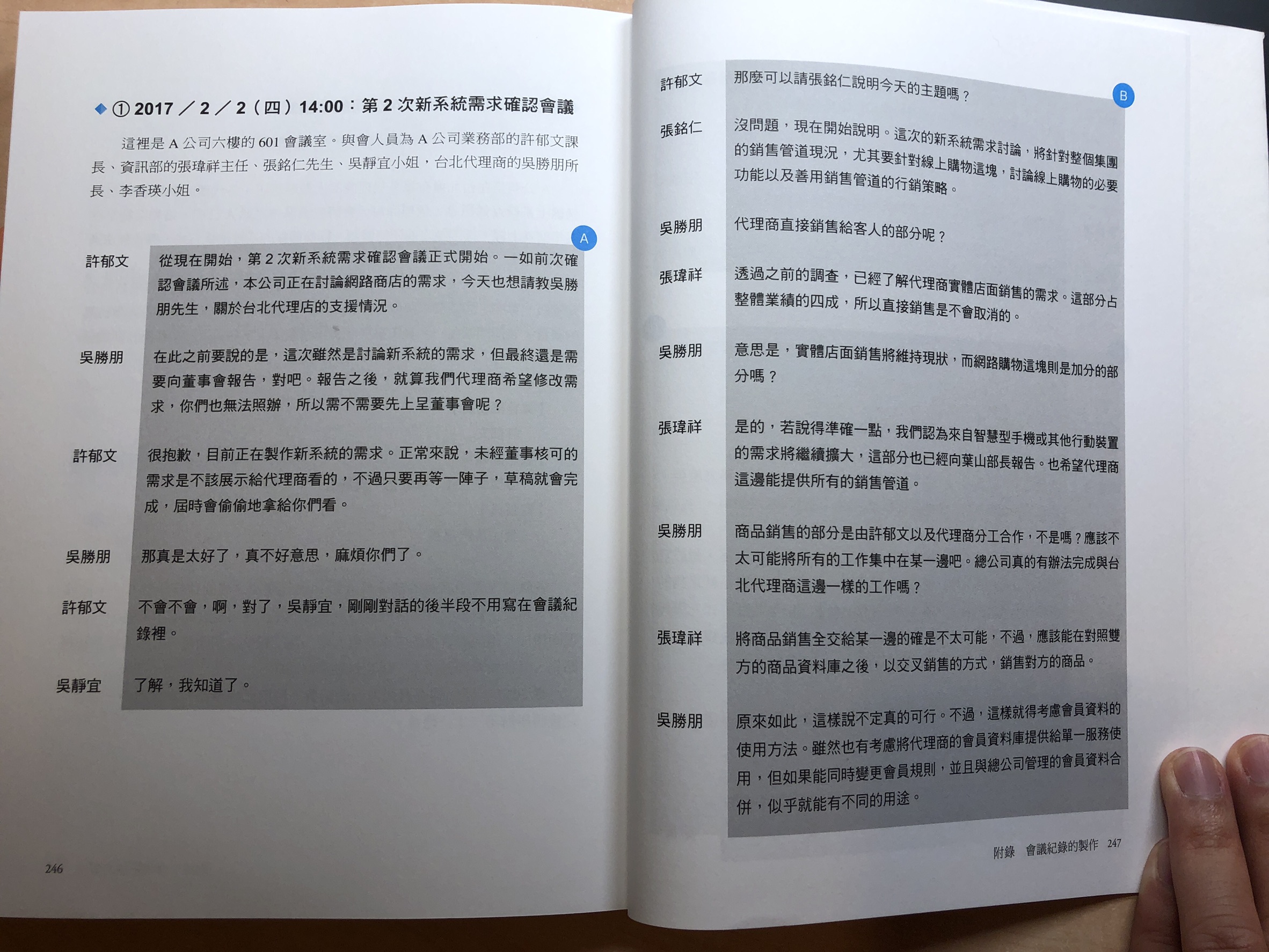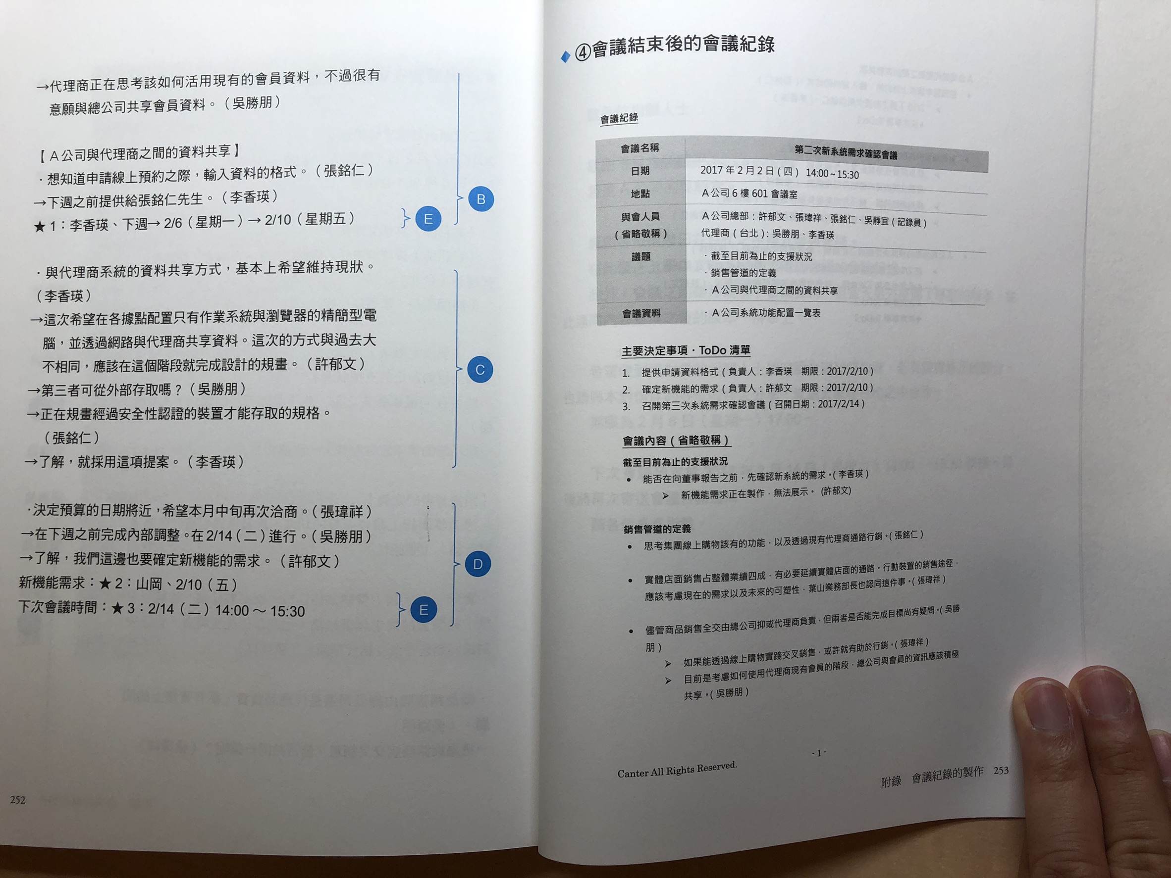 # 做會議紀錄的方法 9. 教學素材 -  -  -  -  -  -  10. 教學架構與整理 - **[[會議記錄]]架構流程** - **架構 -> 草稿 -> 修訂** - 架構可以在會議開始前,事先根據會議形式擬出初稿。 - 草稿可以先給「**上司**」看過。 - 修訂完的會議記錄在得到上司「**允許**」下可以發給所有與會者,為所有人創造最大價值。 -  - **一、架構** - **活動目的**(以吉祥樂學-活動記錄表為例) - 可以補充會議目的 - 可以補充會議討論議題 - **人**: - 原始:研發處曾玟瑄、李哲維(攝影紀錄)、卓真儀、國企系六位學生-林于菁、蔡存旻、蔡奕芃、郭昱思、謝珠華、王雯歆 - 可修正之處 1:**將每個人職稱與活動中角色打下,EX: 卓真儀。** - 可修正之處 2:**並且在徵得當事人同意後,在會議紀錄最下方備註處,打下重要角色的聯繫方式(電話,Email),EX: 研發處曾玟瑄,會議記錄人卓真儀。** - **事**: - 原始:開幕相見歡+運動操 - 可修正之處 1:**活動目的可以也事先打下來。** - 可修正之處 2:**若是會議型會議記錄,須事先寫下討論議題。事後若有新增可以在草稿處增添。若是事先擬的討論議題當次會議沒討論到也請在草稿標註。(範例如圖)** -  - **時**: - 原始:109年 10 月 27 日(星期二) 09 : 30 ~ 12 : 00 - 可修正之處:沒有可修正之處 - **地**: - 南埔社區 - 可修正之處:沒有可修正之處 - **物**: - 原始:無 - 可修正之處 1:**或許可以事先寫下當天主要會用到的道具,物品,設備。** - 可修正之處 2:**事先需要備齊印出 / 或者寄出給大家參考的檔案 / 文件也請寫在這。** - **二、草稿**(還沒給長官看過的會議記錄) - **會議類型的會議記錄草稿** - 會議當下內容要打下聽到得每個人說的「**重點關鍵字**」 - 1. 日期。 - 2. 問句。 - 3. 幾個人對話討論後的結論。 - 註:如果來不及打可以先打以上 3 點關鍵字,但重點是要記錄下每句發言,因為你不知道哪句話長官覺得是重點,可以整個對話草稿給長官讓他挑選重點,你再後續擷取中修訂。 - **記得要給長官確認** - 範例圖片  - **草稿最後寫完給長官看之前的必須要有的「重點」(如以上範例圖片)** - 1. TO 的結論 - 2. 必須寫下負責人 - 3. 還有時間 - 三、**修訂** (根據長官回饋確實修正擷取重點) **版本並且發送給會議相關者的信件內容**(會議記錄放在附件內) - **簡短總結(如下圖):** - 1. 我是誰 - 2. 發這封信的目的 - **簡短摘要:** - 這次結論 - 1. 決定 TODO 事項「負責人」和「時限」 - 2. 下次會議時間(需要參與下次會議的人) - **索取回饋**:若有會議參與者認為有意思上錯誤希望修正,敬請回饋。