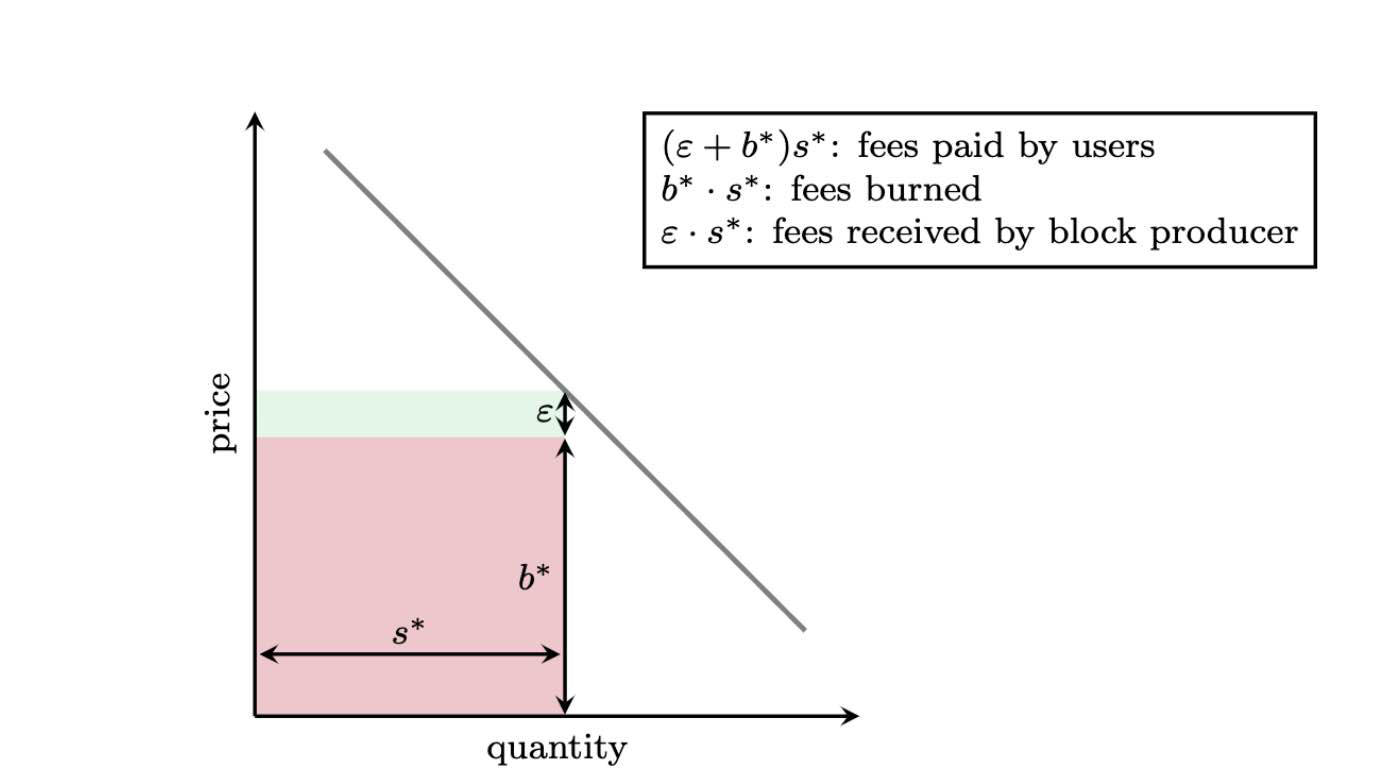 Figure 1: Demand curve for Ethereum transactions. The quantity ( $x$-axis) indicates the number of the transactions willing to pay the transaction fee (price shown $y$-axis). In steady state, $s^*$ transactions are willing to $b^*+\varepsilon$, where $b^*$ is the base fee that corresponds to the target size. The red area is the amount of fees being burned, whereas the blue area are the fees received by the miner.