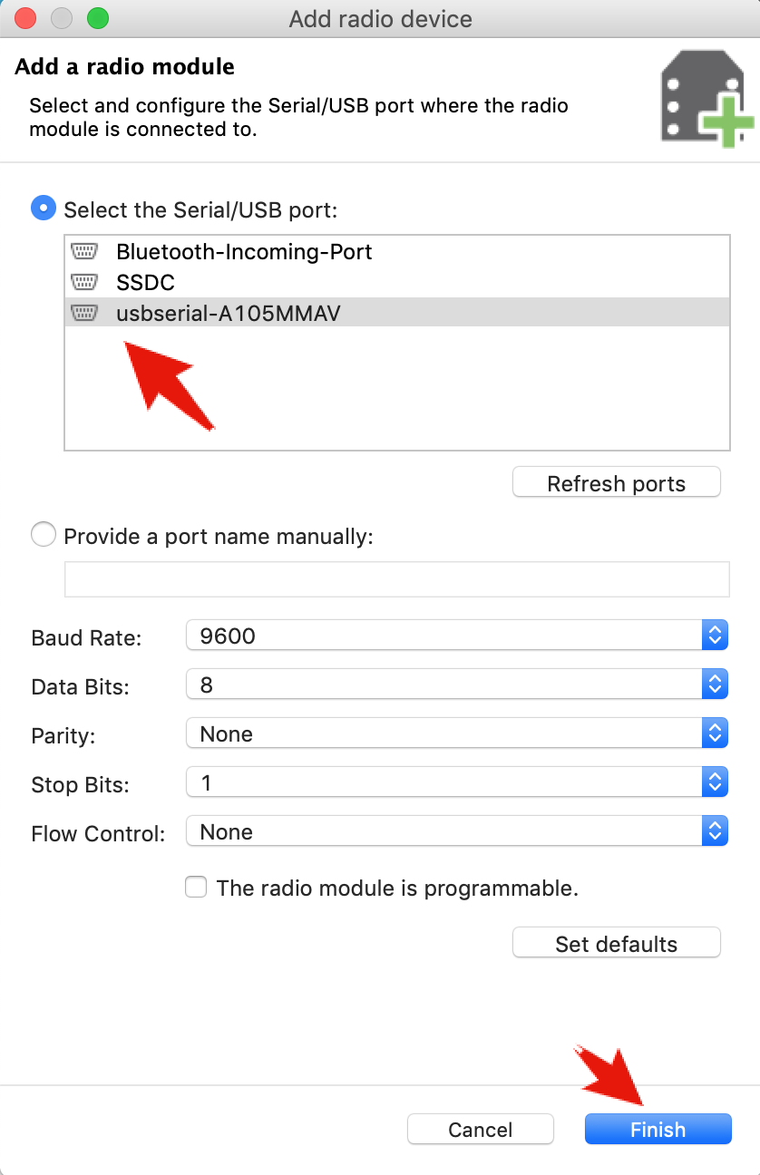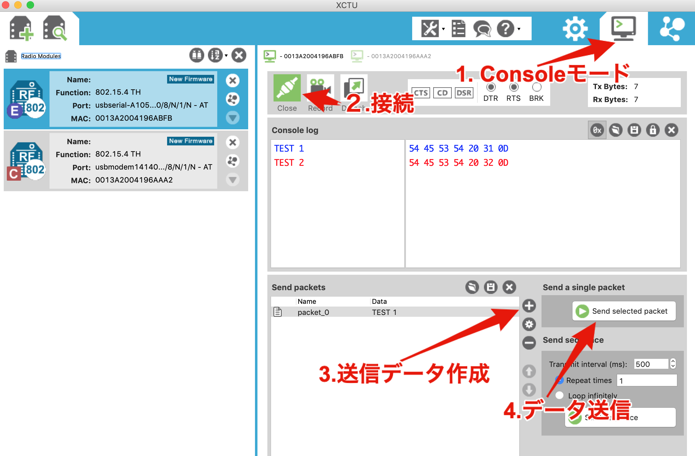 --- description: AruduinoとXBee無線モジュールを使って、無線通信をしてみようと思います。 XBeeモジュールは、X-CTUという専用ツールを使って、設定をしないと使えないので、まずは設定を行います。 image: https://lh3.googleusercontent.com/T4tsOKolksNaM141oDWo-6oo2JcdFH0SpjtHFBOXSZ6-hwdPSnMHG3rq2GpUMCFhd-3ir2nL282vaR7VAd9lwp1ymWs4uQmzjpPsFV0akzdE2teRCXZu07Syv8pvEVkaBr69xCJ32kc=w1024-no tags: Aruduino, XBee lang: ja-jp --- # AruduinoとXBeeで無線通信してみる(設定編) AruduinoとXBee無線モジュールを使って、無線通信をしてみようと思います。 XBeeモジュールは、X-CTUという専用ツールを使って、設定をしないと使えないので、まずは設定を行います。 ## 使うもの(ハードウェア)  - [Aruduino UNO](https://amzn.to/2IAQiRS) - [Xbee S2C](https://amzn.to/2ICWcBV) - [XBee USB アダプター(リセットスイッチ付き)](https://amzn.to/2MuucBs) - [Arduino用Xbeeシールド](http://akizukidenshi.com/catalog/g/gM-07030/) ## 使うもの(ソフトウェア) - [XCTU](https://www.digi.com/support/productdetail?pid=3352&osvid=57&type=utilities) XBeeの設定を行うためのツールです。 ## XBeeの設定 XCTUを使って、お互いの通信相手のMACアドレスを設定します。 MACアドレスは、それぞれのXBeeモジュールに割り当てられた個別の64bitのアドレスで、XBeeモジューの裏側に記載されています。 とりあえず、今回利用する2つのXBeeのMACアドレスをメモしておきます。 1. 0013A2004196ABFB ←利用するXBeeのMACアドレス 2. 0013A2004196AAA2 ←利用するXBeeのMACアドレス ### XCTUで設定 1. **XBeeをPCに接続** XBeeをUSBアダプターに取り付けPCとUSBケーブルで接続します。  1. **XCTUを起動** 1. **XBeeを認識させる** - ```+```の付いたアイコンをクリック  - USBポートと、シリアル通信の設定を確認して「Finish」  1. **設定内容の読み込み** - 認識されたXBeeモジュールをクリック  1. **通信相手の設定** - ID : 通信相手と同じ値を設定する必要があります。 (同じであれば良い) - DH : 通信相手のMACアドレス上位32bit - DL : 通信相手のMACアドレス下位32bit  1. **役割設定** - 1台を[Coordinator]、1台を[End Device]にする必要があります。  1. **通信設定** - ボーレートやパリティの設定をメモしておきます。 - AP : 今回はATモードを使うので、「API Disabled」  1. **設定書き込み** - [Write]ボタンで変更した設定をXBeeに書き込みます。  同じように、もう一台も設定します。 ## ArduinoをPCに接続して通信確認 Aruduinoのプログラムはせずに、単純にUSBインターフェースとして使います。 ### Aruduinoに空のプログラムを書き込む 単純にUSBインターフェースとして使う場合、Aruduinoに空のプログラムを書き込みます。 **Aruduinoにプログラムを書き込む際は、Xbeeシールドを外しておきましょう。** Arduino IDEのメニューからファイル(File)→ スケッチの例(Examples)→01.Basics→BareMinimumを開き、Arduinoにアップロードします。 ### AruduinoにXBeeを接続 XbeeシールドにXBeeを挿入し、XBeeシールドをAruduinoに接続します。 この際、Xbeeシールドのスイッチは以下のようにします。 - [RUN/PROG] -> RUN - [XBEE/USB] -> USB ### 2つのXBeeをそれぞれPCにUSB接続 それぞれUSBケーブルでPCに接続します。  ### XCTUで2つのXBeeを認識 ```+```アイコンで、それぞれのUSBインターフェースを選択して、2台のXBeeを認識させます。 1. コンソールモードに切り替え 2. 通信接続(2つとも接続状態にします) 3. 送信データ作成 4. データ送信(お互いにデータを送信してみます) Console logに、データが表示されていればOKです。 青が送信したデータ、赤が受信したデータです。  #### 実験:送信先MACが違うと送信されないか? 片方のDLに違う値をいれてみます。 結果: - DH,DLは送信先のアドレスなので、変更した先のデータは届かなかったです。 - DH,DL共に0に設定すると、送信データが相手に届いたので、MACアドレス関係なく全モジュールに送信するようになるみたいです。 #### 実験:Coordinator/End Deviceを変えるとどうなる? - [EndDevice]-[EndDevice]: 通信できました。 DH,DL=0でも送信できました。 - [Coordinator]-[Coordinator]: 通信できました。 2台での通信では、どの組み合わせでも関係なさそう。 ## 参考サイト [XBeeをはじめてみよう(シリーズ1編) – スイッチサイエンス マガジン](https://mag.switch-science.com/2012/07/20/startup_xbee_s1/)