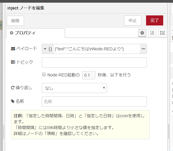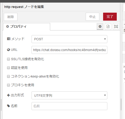 --- description: RaspberryPiのNode-REDで、http-requestを使って簡単にMattermostへの通知を試してみます。 image: https://i.gyazo.com/db734225d9b571a87d510efcc1d2980a.png tags: RaspberryPi, Node-RED lang: ja-jp --- # RaspberryPiでNode-RED http-request(Mattermost通知編) RaspberryPiのNode-REDで、http-requestを使って簡単にMattermostへの通知を試してみます。 ## とりあえず送信  - inject ペイロードをJSONに設定し、内容を、 ```json= { "text": "こんにちは\nNode-REDより" } ```  - http request メソッドをPOST URLは、Mattermostの内向きのウェブフックで取得したURL  デプロイして、injectのボタンを押すと、Mattermostにメッセージが送信される。  できた! ## まとめ http requestノードを使うと、簡単にウェブフックを簡単に呼び出せる。 1. ウェブフックに渡すjsonを、msg.payloadに設定 2. http requestノードに、```メソッド``` ```URL```を設定 今回は、Mattermostへの通知でしたが、Slackへの通知も同じようにすればできるはず。