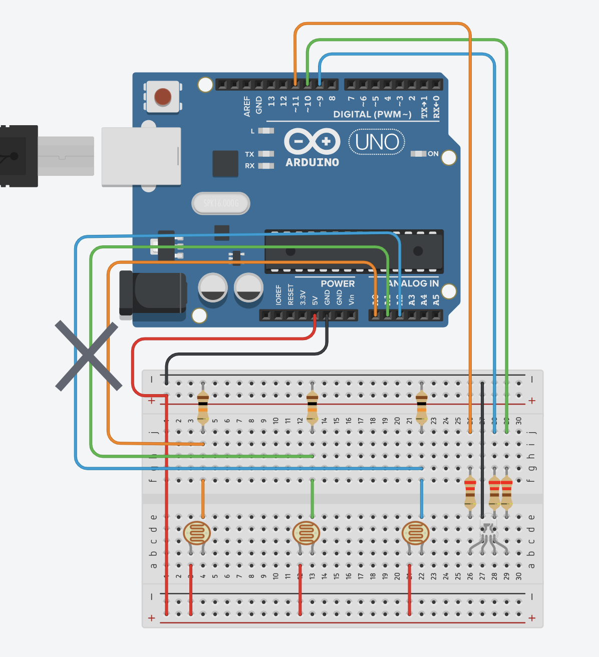 - 在圖中三個光敏電阻大小各代表對應的 RGB 讀值,當光線變強時,類比輸入的讀值變得愈大,試著改變 RGB 大小來調整出以下各種顏色。