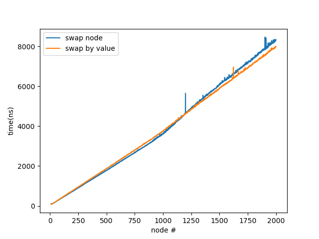 仔細一想,就發現其實自己把問題複雜化了,因為 `XORSWAP_UNSAFE` 的指令會比 `XORSWAP` 少,不需要讀取記憶體位址檢查是否相同,所以可以執行的快一些原本就十分合理。而當節點變多,指令的差異量就會表現在時間上。