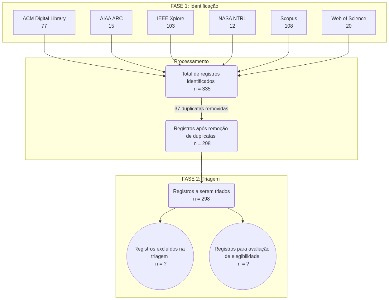 **Execução da Busca Principal**: Foi realizado a busca sistemática em todas as 6 bases (`IEEE`, `ACM`, `Scopus`, `WoS`, `AIAA`, `NASA`) e registrado os resultados em um diário de busca