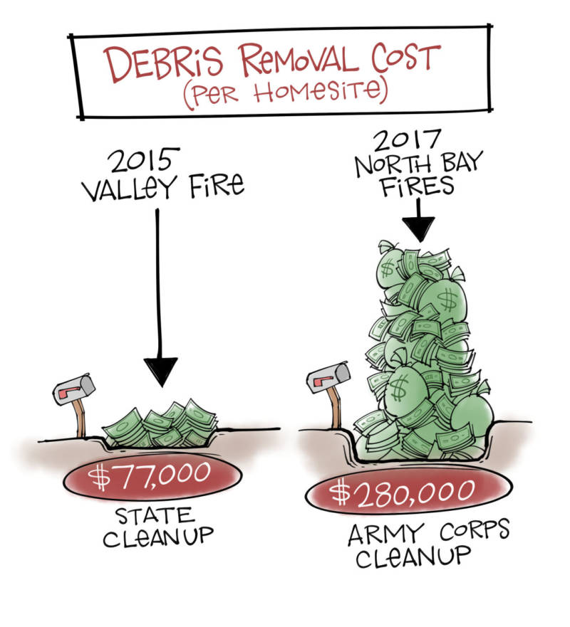 <small>[2017加州野火善後弊端](https://www.kqed.org/news/11681280/cleaning-up-inside-the-wildfire-debris-removal-job-that-cost-taxpayers-1-3-billion)</small>