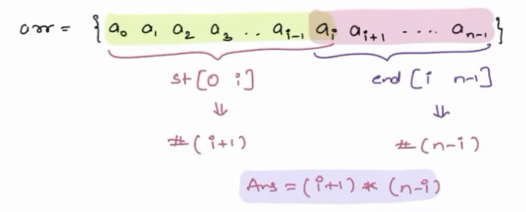 This gives us the expression `(i+1) * (n-i)` where i is the index of the element starting (0-based indexing) and n is the length of the array.