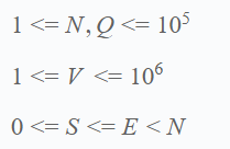 For each query: Given (s,e,V) add V to all the index elements from [S...E]