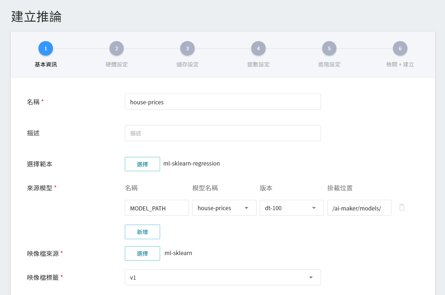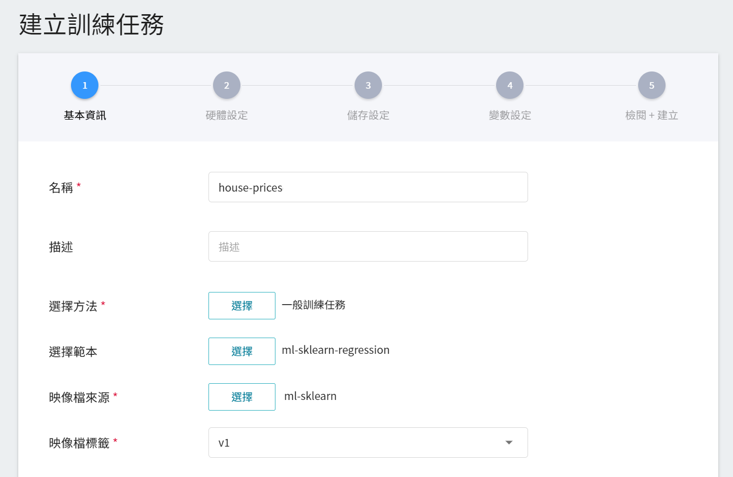 第一步是基本資訊的設定,依序輸入名稱、描述、選擇方法,並選擇 **`ml-sklearn-regression`** 範本,此範本會自動帶出公用映像檔 **`ml-sklearn:v1`** 以及後續步驟的各項參數設定。