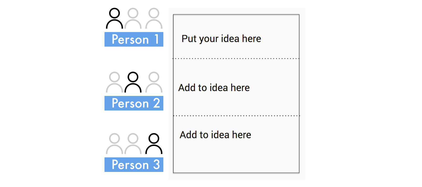 **Estrategia**: A través de la "ideación aditiva", un equipo puede trabajar en conjunto sin perder tiempo discutiendo los pros/contras de una idea. Diferentes cabezas resuelven problemas de diferentes formas, remodelando la solución en cada paso. Esta es una forma divertida de explorar dónde puede ir una idea y salir de su forma de pensar cuadrada.