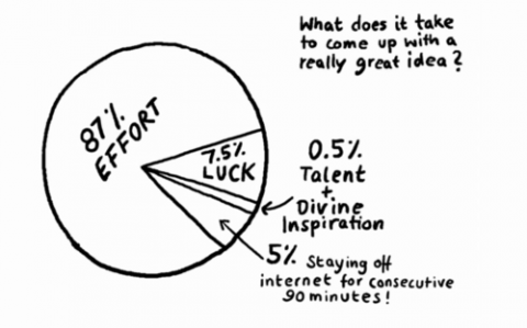 Esto puede ser cierto para un porcentaje muy pequeño de ideas (como las probabilidades de ganar la lotería), pero en realidad, la mayoría de las grandes ideas provienen de una comprensión profunda del problema y un montón de intentos fallidos.