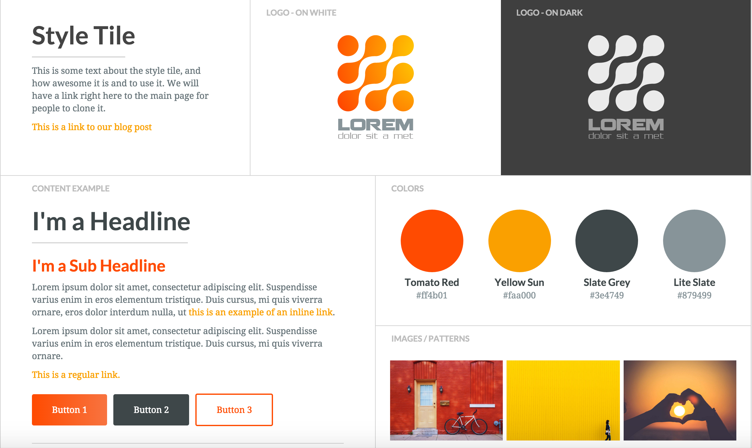 A style Tile provides a bit of more emphasis on individual component details (like typography, font size, and button styles) while still capturing elements of the overall look and feel.