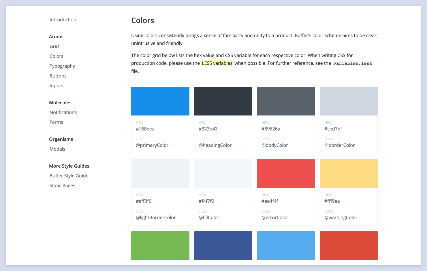 *For example, instead of coding a blue button on the login page and providing it with CSS classes such as "Button-login," they will see this blue button in the Style Guide and give it a "Button-blue" class reused on the website. Reusing the component saves a lot of time for developers. It also ensures that no matter how many devs are working on the code, the CSS labeling remains consistent*