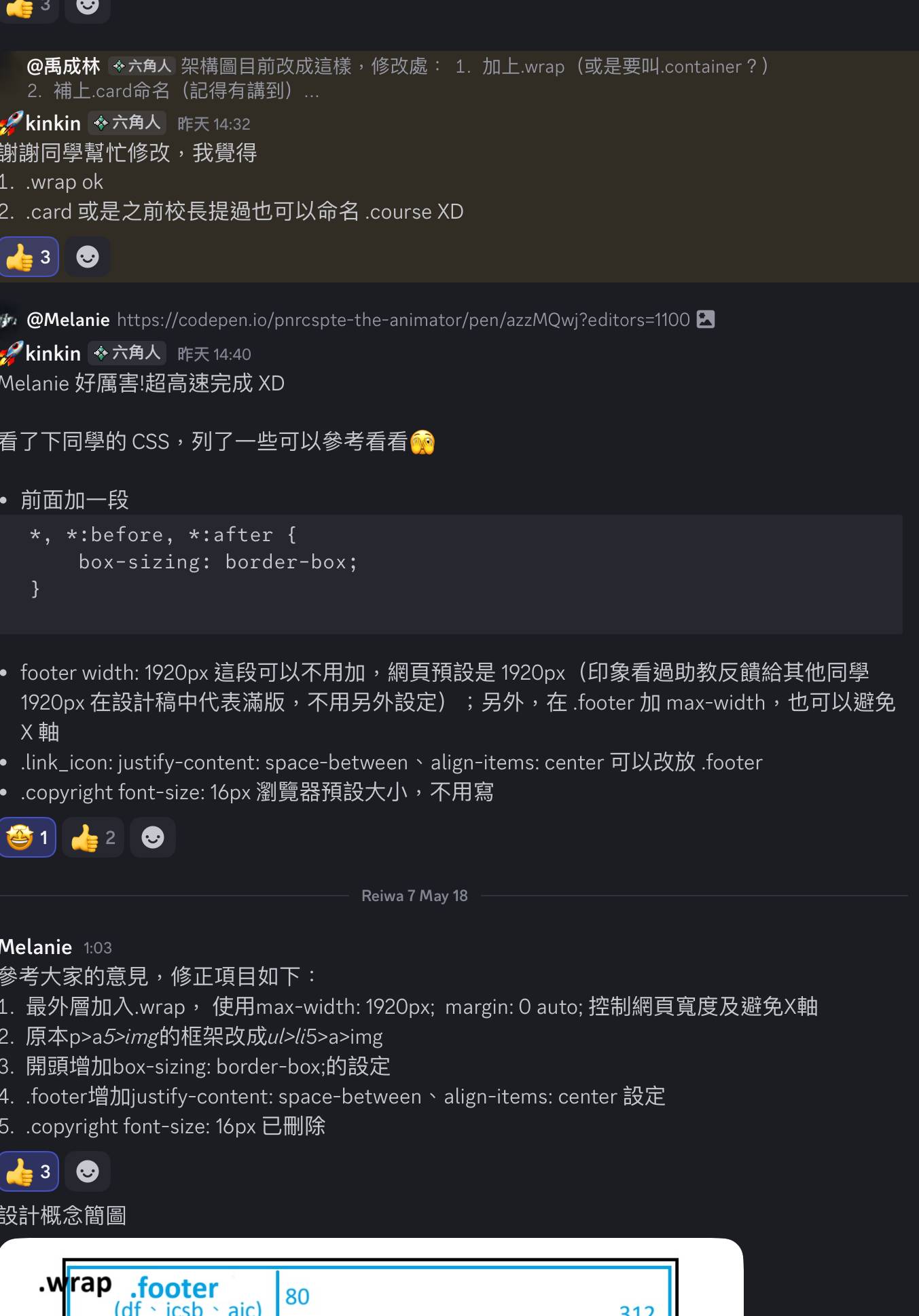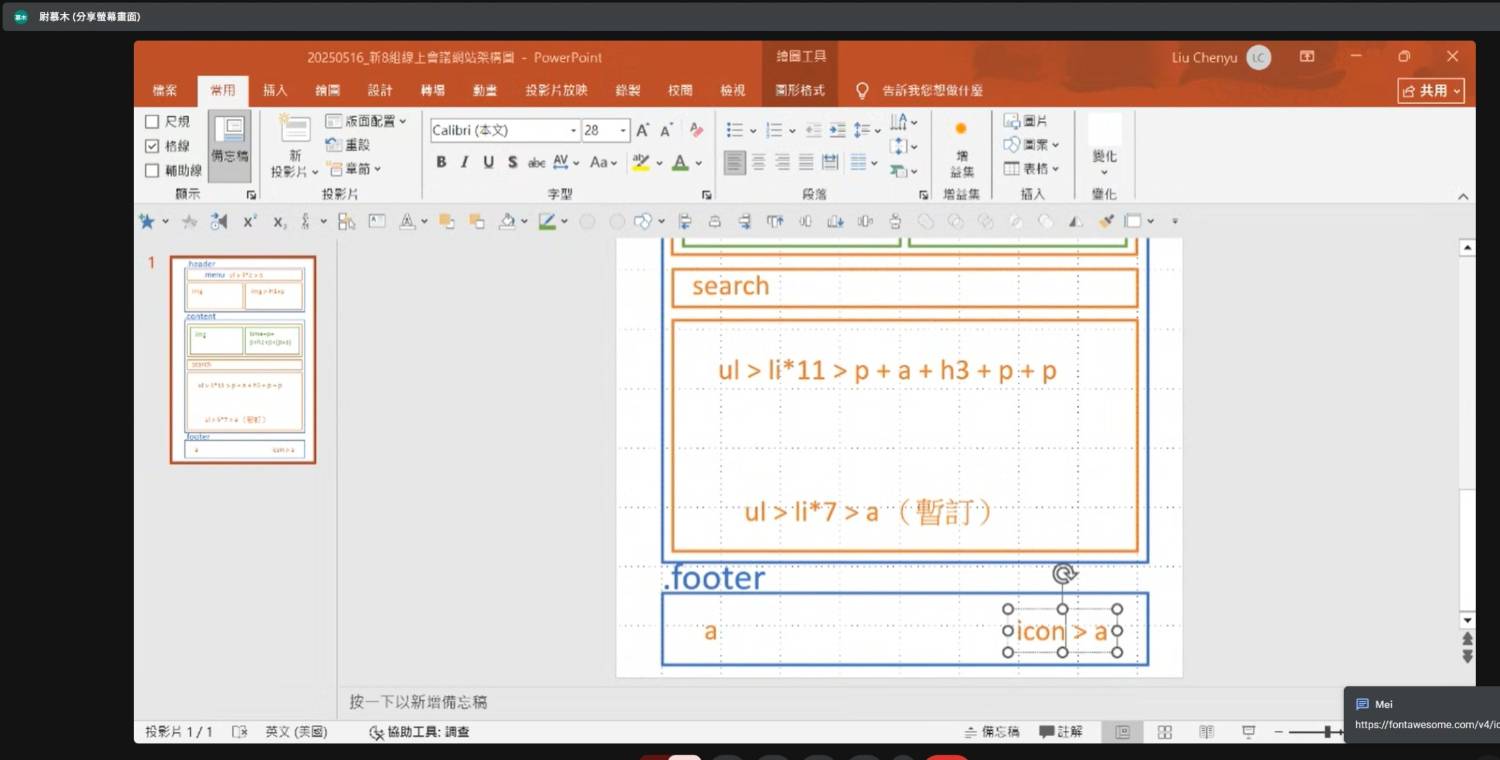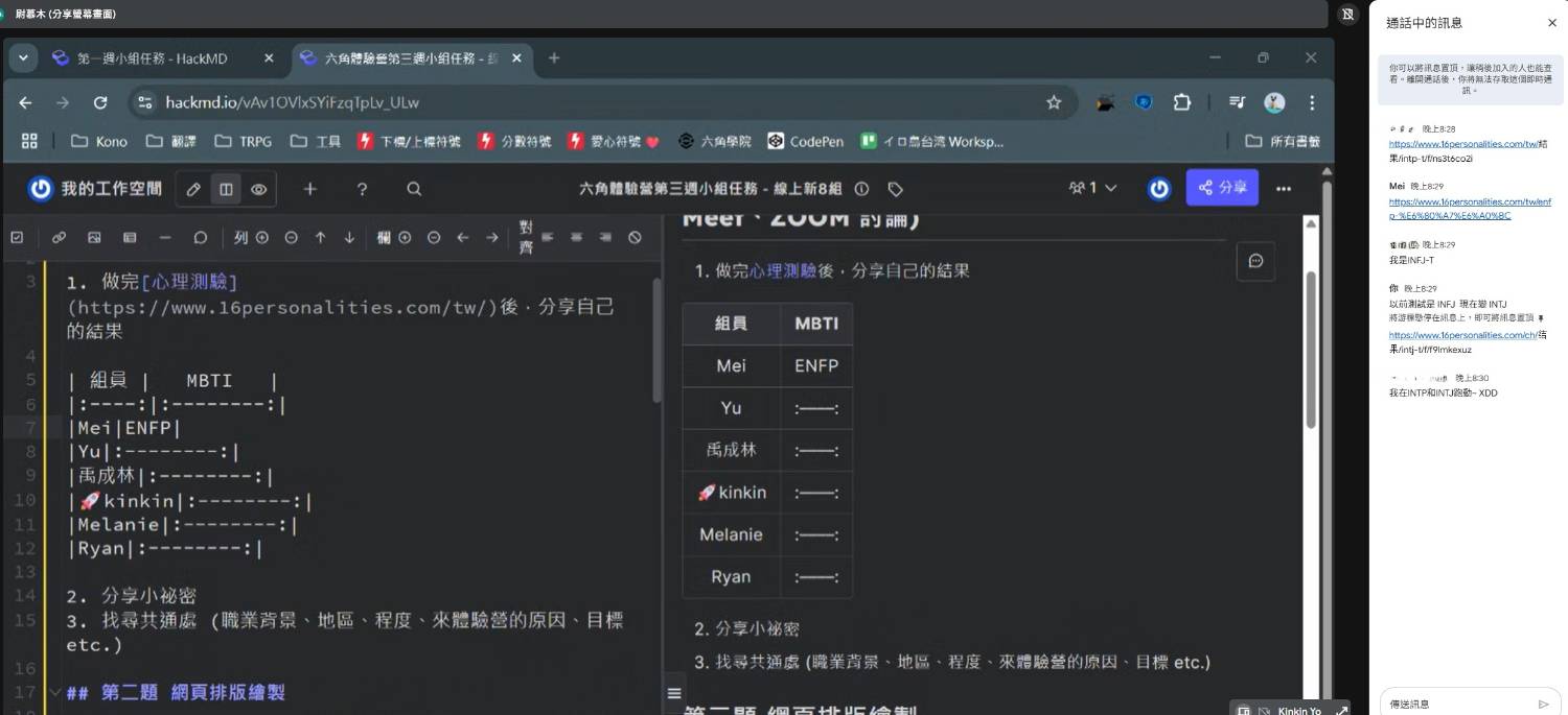 ## 第一題 心理測驗 (需約一天進行 Google Meet、ZOOM 討論) 1. 做完[心理測驗](https://www.16personalities.com/tw/)後,分享自己的結果 | 組員 | MBTI | |:----:|:--------:| |Mei|ENFP-T| |Yu|INTP<->INTJ| |禹成林|INTP-T| |🚀kinkin|INFJ→INTJ-T| |Melanie|INFJ-T| |Ryan|:--------:| 2. 分享小祕密 - [X] 已完成 3. 找尋共通處 (職業背景、地區、程度、來體驗營的原因、目標 etc.) - [X] 已完成 ## 第二題 網頁排版繪製 證書任務一 (Flex 切版任務 - 部落格文章卡片設計) 或二 (最終任務 - 個人品牌網站) 的整頁 div 架構結構圖 ### BLOG 全頁面架構圖 討論:全員|繪製:禹成林  ### footer 設計概念簡圖 繪製:Melanie  ## 第三題 證書任務合作無間!!隔週三 (5/21?) 洧杰針對各組程式碼提供講解 「[最終任務 - 個人品牌網站]((https://www.figma.com/design/bBHUp0TeM0yjAlkjtyxQJI/2025ver.-%E9%AB%94%E9%A9%97%E7%87%9F%E5%AD%B8%E7%94%9F%E8%A8%AD%E8%A8%88%E7%A8%BF?node-id=236-1109))」的BLOG頁面認領~ - [X] 已完成 ### 任務進行狀態 👩💻製作中|✅已完成|🏃持續調整中 | 組員 | 分工任務 | 狀態 | 200%進度🚀 | |:-------:|:----------------------------------------------------------------:|:---:|:--------:| |Mei |[nav、title (合作)](https://codepen.io/painter10820/pen/Pwwgpmp) | ✅ |[nav、title、banner](https://codepen.io/painter10820/pen/MYYdwYR)| |Yu |同上 | ✅ |[nav、title](https://codepen.io/Yu_Chang/pen/jEEYpJv?editors=1100)| |禹成林 |[banner、search bar](https://codepen.io/useirin/pen/jEERLQv) | ✅ |[Blog全頁+RWD](https://codepen.io/useirin/pen/PwwvdRb)| |🚀kinkin |[content card](https://codepen.io/Kinkin-Yo/pen/myygJBK) | ✅ |:--------:| |Melanie |[footer](https://codepen.io/pnrcspte-the-animator/pen/azzMQwj) | ✅ |[Blog全頁](https://codepen.io/pnrcspte-the-animator/pen/raabgja)| ## 小組相關 ### 報到組員 (按報名填單順序) - [x] Mei (mei479) - [x] Yu (light_2020_03026) - [x] 禹成林 (.yuchenlin) - [x] 🚀kinkin (kinkin_yo) - [x] Melanie (melanie_42483) - [ ] Ryan ### 組內行事曆 組隊日:2025/05/14 (三) 21:30 任務單建立:2025/05/15 (四) 09:30 組團回報:2025/05/16 (五) 06:30 線上會議:2025/05/16 (五) 20:00~21:40 > > 之後一直有在discord上持續討論~ > 任務初稿完成:2025/05/18 (日) 22:30 任務繳交回報:2025/05/19 (一) 18:50 ※小組任務需在下週三 (5/21) 前回報 ### 會議參考連結 [使用icon字型](https://ithelp.ithome.com.tw/m/articles/10200426) [icon字型使用範例&css語法](https://fontawesome.com/v4/icon/phone) [fontawesome icon網站](https://fontawesome.com/) [每日切版任務 Day6 - Bootstrap icon 引入](https://hackmd.io/upmXPi-uRCWZ75cfAH999w) [每日切版任務 Day5 - Google Fonts 線上外部字型載入](https://hackmd.io/5T4Q1PC5RnWCm2dj_AKIvg) ### 討論紀錄截圖