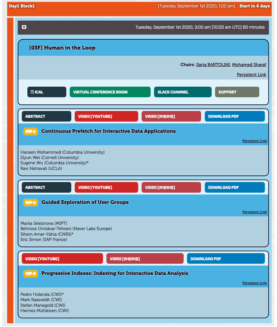 Please scan the [interactive conference program](https://vldb2020.org/program.html) from top to bottom. This view will give you a sense of the overall conference structure.