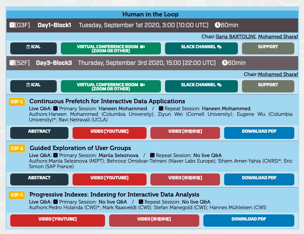 To search the conference program for specific papers, authors, or topics, we recommend that you use the [**flat** conference program](https://vldb2020.org/program_flat.html).
