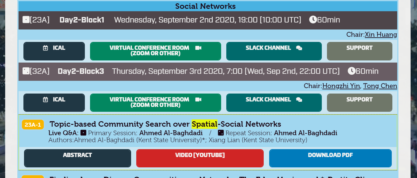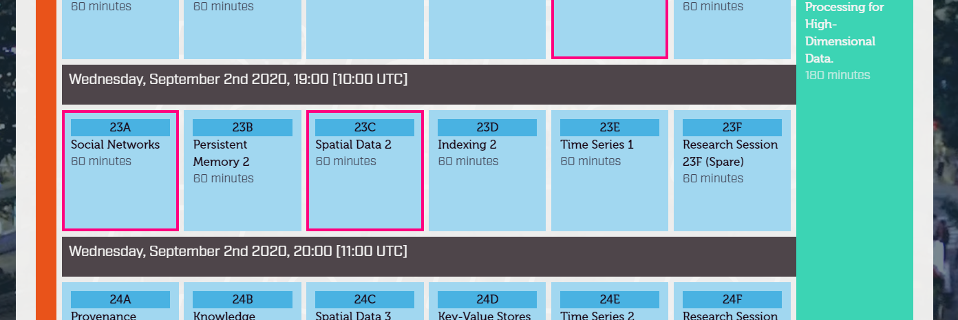 At the end of each block, we have one hour of social and sponsor activities. Please use the [**interactive** program](https://vldb2020.org/program_flat.html) for more information.