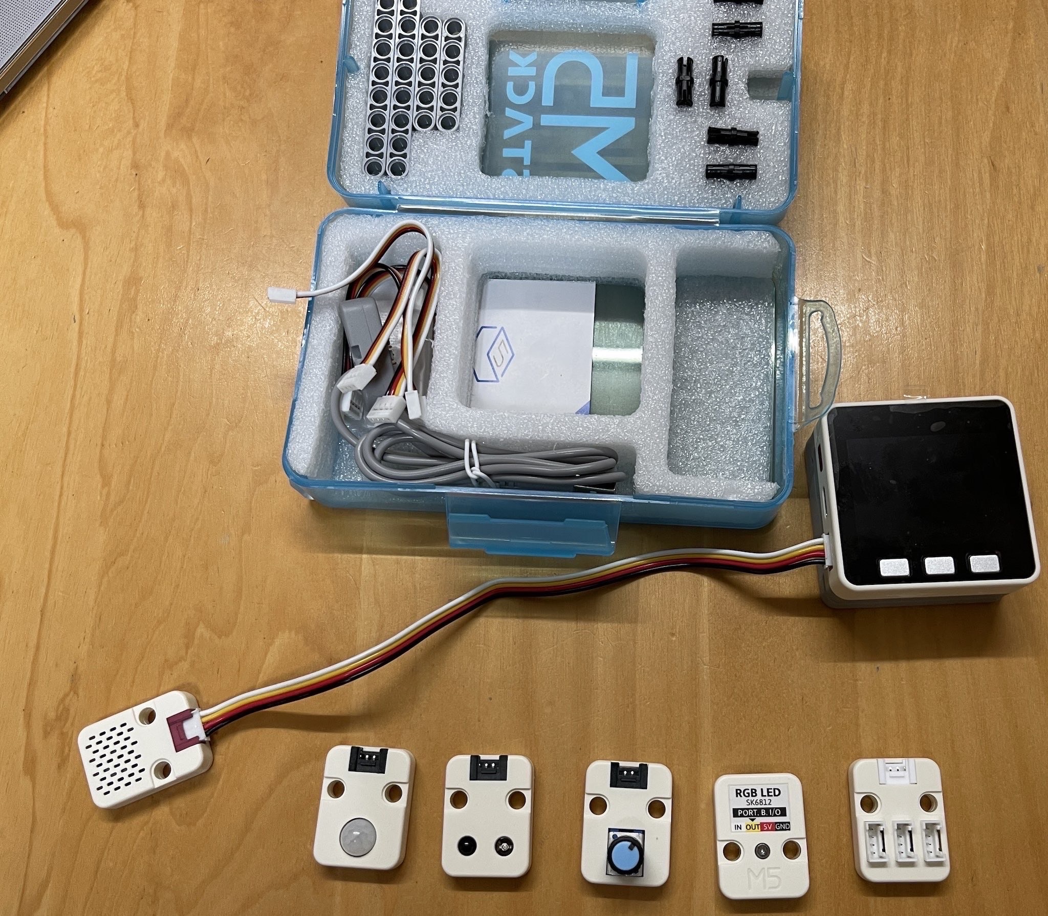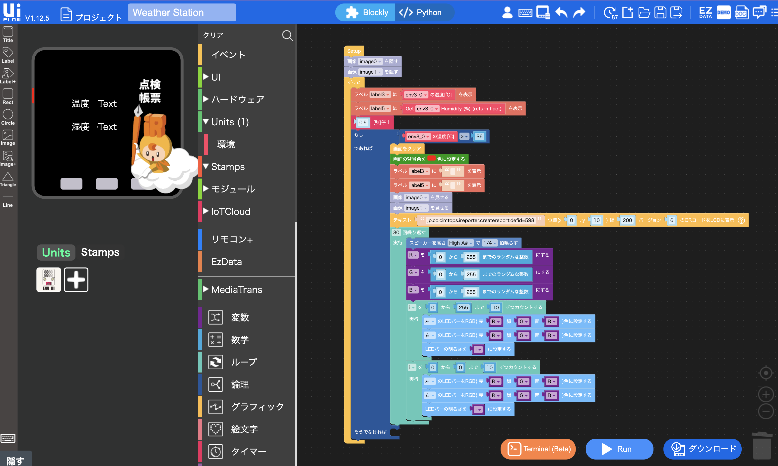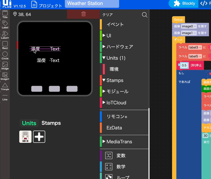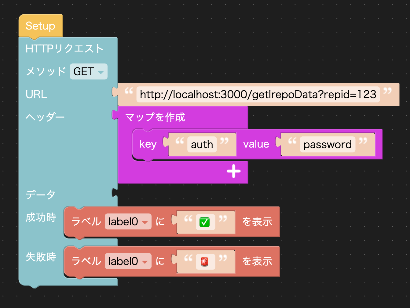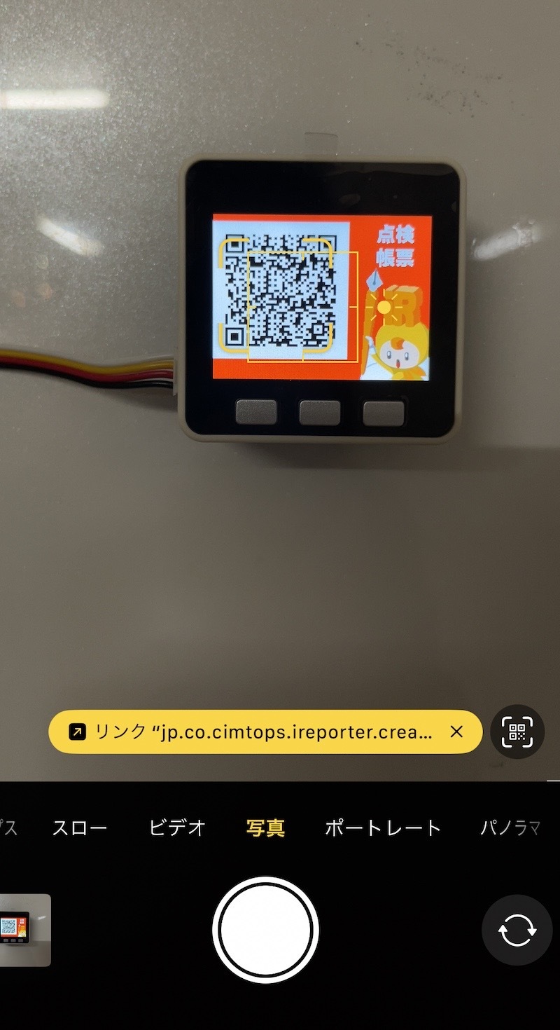 # アイレポとM5STACKでノーコードIoTやってみた みなさんこんにちは。 自称アイレポエバンジェリストのmnrです。 ユーザー会でいつもお世話になっています。 さて秋ですね〜〜〜。こんな天気の良い日は家でIoTに限りますよね!! ということで今回作ったものの完成品はこちらです。 ## 温度が35度を超えると音と光でアイレポ帳票起動QRを表示する仕組み! | 正常時 | 家の冷蔵庫にM5GO| | -------- | -------- | | <img src="https://i.gyazo.com/82d4eb6d367ff2521f0c6eb7313b275a.jpg" width="80%"> センサーは0.1秒ずつかなり精度が高い計測が可能です | <img src="https://i.gyazo.com/6b1448ee6af4b570b9b8f511cf8b317d.jpg"> 磁石が便利 | | 異常時 | 室温が35度を超えると | | -------- | -------- | | <img src="https://i.gyazo.com/27718379155d1bd4a0ae4bfebf70be49.jpg" height="100%"> アイレポのカスタムURLスキーム QRが表示される | <img src="https://izu-area.com/irepom5.gif" > [動画音あり](https://drive.google.com/file/d/1BLhrc_C1zD1mFpH4lozrbFqK3B0OqwDD/view?usp=sharing) アイレポちゃんがパトランプに| [35度にするためドライヤーでセンサーを温める私(動画)](https://drive.google.com/file/d/1X_SVMF4sTVSN7rnZxtaWFE5fxQboYFTF/view?usp=drive_link)  ## センサーの異常時に目的の指示書付き帳票を起動する --- さて、どのように作ったかご説明します。 今回はM5GO IoTスターターキットv2.7を購入してみました。   M5StackシリーズのM5GOを開封しましたら液晶ディスプレイをはじめとしてGrove端子対応の簡単接続センサーがついていました。 特に説明書など見ないで始めることが出来ました。 M5Stackとは > M5Stack: > コンパクトな筐体の中に、ESP32マイコン、液晶ディスプレイ、ボタン、バッテリー、スピーカ、I/Oなど様々な機能が盛り込まれています。Wi-FiやBluetoothによる無線通信なども可能です。また、Grove端子がついているため、さまざまなセンサーや部品を簡単に接続できます。 > > Raspberry Pi(ラズパイ): > 手のひらサイズのコンピューター。Linuxを動かせて、多機能。さまざまな部品をGPIOピンでつなげることができます。 Grove端子とは > Grove端子とは? Seeed社が開発した端子の名称で、4ピンの端子を利用してマイコンとセンサなどを接続するための規格になります。 ハンダ付けをする必要がないのでとても簡単です。 * 環境センサ・・・温度、湿度、気圧のセンサー * 赤外線リモコン・・・赤外線信号を送受信 * RGBライト・・・ピカピカすることが可能 * 人感センサー・・・人が近づくと反応 * 角度センサー・・・つまみの角度を取得 センサーは後述する仕組みで容易に取り込む事が可能で、また嬉しいのがレゴと互換がありますので家にあるレゴで3Dプリンターなしで可愛い筐体などを作れます!  では、今回は環境センサーから温度と湿度を取得したいと思います。 以下の画像ようにUIFlowでブロックプログラミングをしていきます。Pythonで書くことも可能でArduino IDEでも開発も可能です。 > 「UIFlow」は、M5Stack社が開発している、ブロックタイプのプログラム開発環境です。 「Scratch」などと同じように、さまざまな機能をブロックを組み合わせることでプログラミングできます。 > ※実際のシステム完成画面。ブロックで組み立てている ディスプレイに関しては見たままドラッグアンドドロップで調整が可能です。 アイレポちゃんの画像もそのまま取り込み画面を作っていきます。  たとえばM5GOの画面にセンサーの値を表示するのはこれだけで可能です。   完成品コードはこちらです。  複雑そうに見えますが実際にはM5STACK社のわかりやすいデモブロックがありますので読み込んで実行して真似しているだけです。  # アイレポ カスタムURLスキームは一番手軽に使える自社システムとの連携手段 アイレポとの連携はカスタムURLスキームというアイレポの機能を使用しています。とても好きな連携方法でたくさんの弊社のウェブシステムはこの方法で連携しています。 アイレポカスタムURLスキームのマニュアル https://cimtops-support.com/i-Reporter/ir_manuals/jp/custom_url_scheme/CustomURL_Scheme_Overview_jp.pdf こんな感じに使えます。 ``` jp.co.cimtops.ireporter.createreport:defid=999 ``` > これで定義ID999から帳票を作成するという機能になります。 > 自社ウェブシステムと連携する際は以下のようにHTMLでAタグで囲む形で利用しますが ``` <a href=”jp.co.cimtops.ireporter.createreport:defid=999”> 帳票を作成する </a> ``` M5GO UIFlowでは以下のようにブロックを使用しています。  実際のセンサーの値を取得して帳票起動したい場合は [[クラスター名]=[入力値]] の形式でセンサーの値を渡すことも可能です。 開いた帳票に指定された[クラスター名]に一致するクラスターに対し[入力値]をセットします。 ``` jp.co.cimtops.ireporter.createreport:defid=2290&tempature=abcdefge ``` パトランプ的に使う仕組みは応用効きそうですね。  センサーの値に応じて帳票定義のQRを変えるのもよさそう # アイレポのAPIを使用してM5STACKディスプレイに表示  先ほどはアイレポを起動する活用でしたがM5STACKでは`httpリクエストが可能`ですので定期的にアイレポのapiをコールして点検