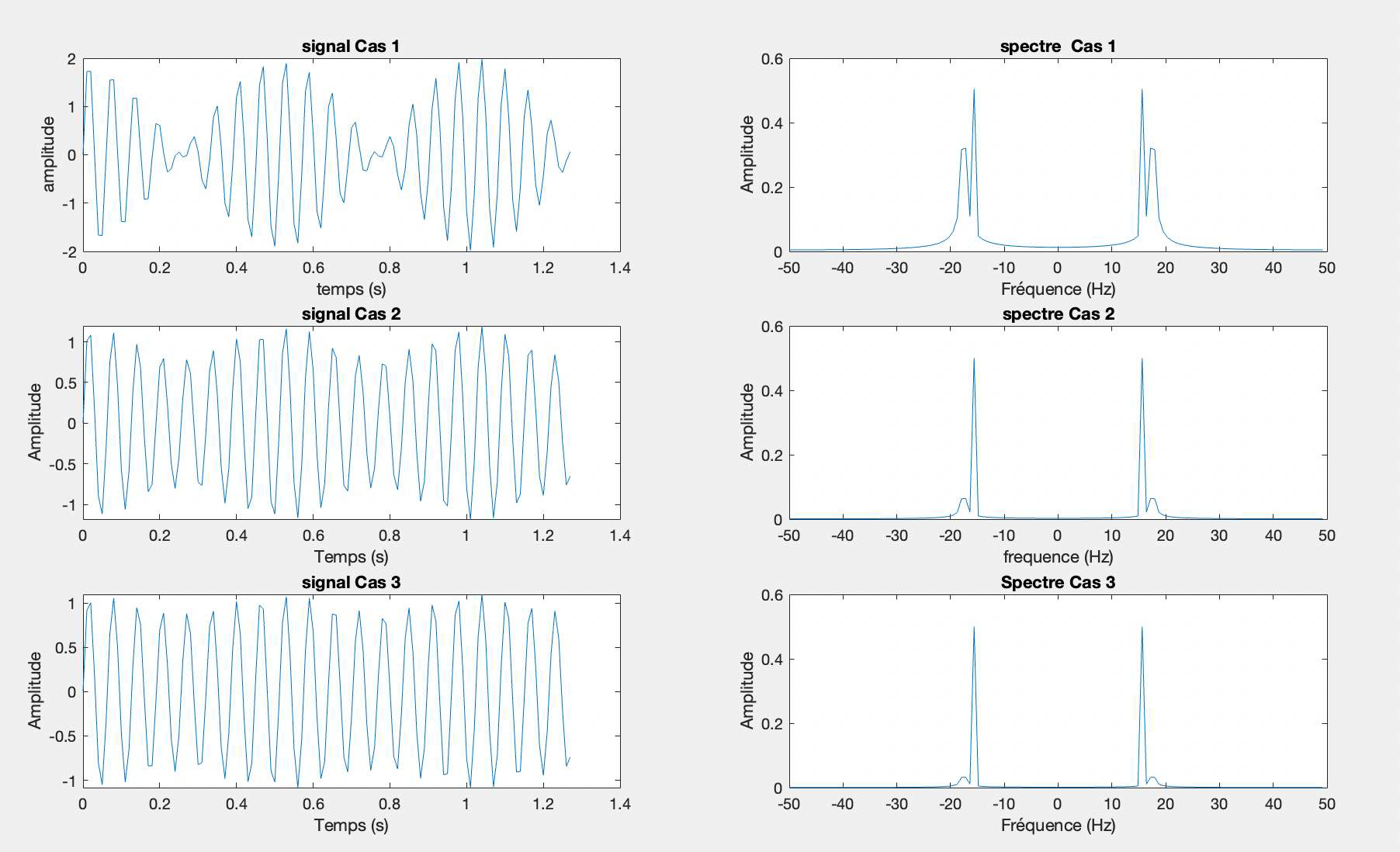 En comparant les trois cas, on peut déduire que le Cas 1 est un signal plus complexe avec des composantes de fréquence multiples, tandis que les Cas 2 et Cas 3 sont des signaux plus simples, montrant des tonalités pures avec une seule fréquence dominante. Le Cas 3 a une fréquence plus élevée que le Cas 2, ce qui signifie que le signal oscille plus rapidement dans le temps. Ces différences peuvent avoir diverses implications dans le contexte de l'analyse des signaux, telles que l'identification de la nature du signal, la détermination de la réponse d'un système, ou l'analyse harmonique pour la musique ou l'ingénierie.