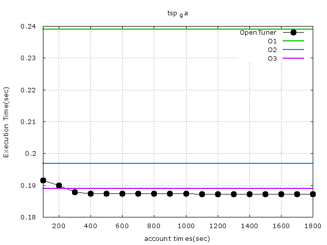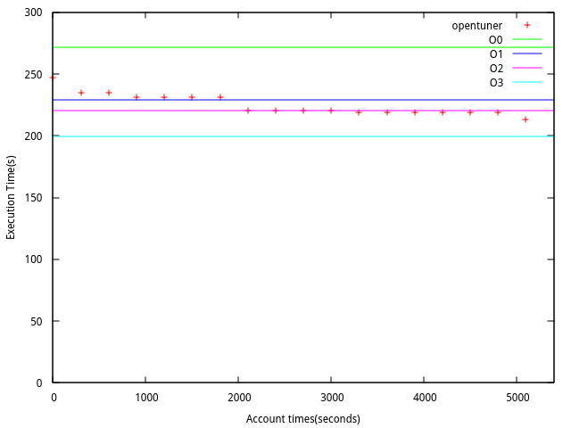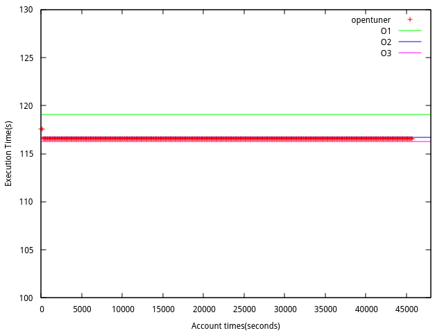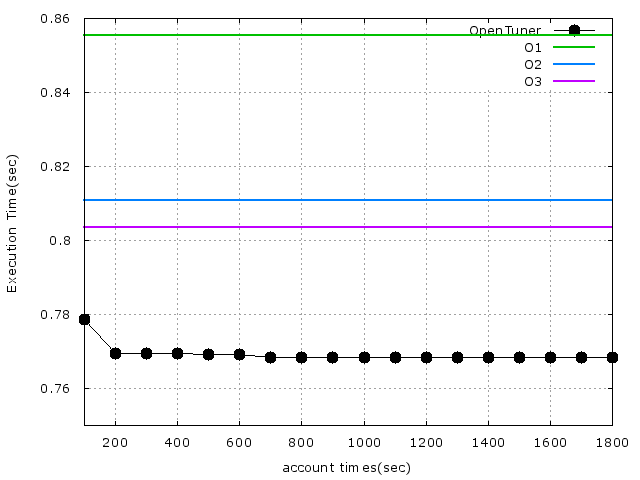 1. 在Makefile 原有的參數維持不變, 然後使用opentuner 加入參數進去, 在經過1個半小時實驗的結果.