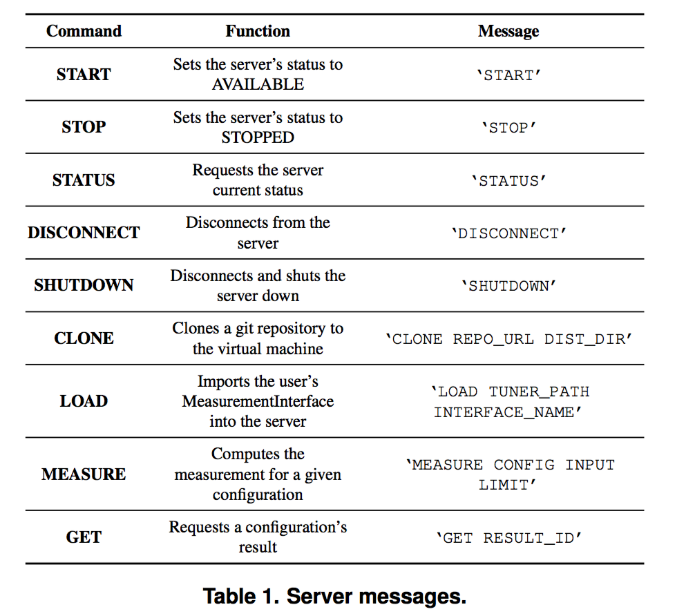 * 方法主要是採用client-server的架構, 在幾個VM中去執行MeasurementServer, 這些server 等待client的請求, 然後將優化過的程式資訊保存下來