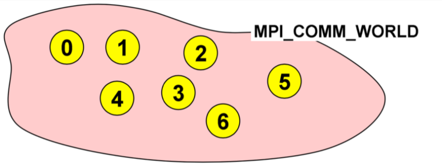 To start, we need to understand what a communicator in MPI is. As we launch MPI, the entire environment puts all the processes and the cores that are involved in this application and binds them together in what is referred to as a *communicator*. A communicator is like a set that binds all the processes together and corroborates that only the processes that are together in an application can communicate with each other. The default communicator that we will use most often is