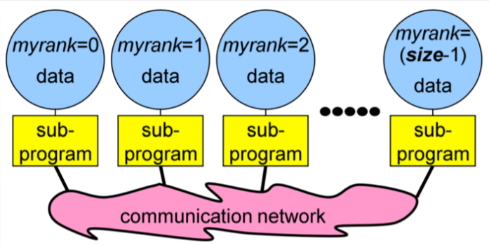 This helps us in identifying and using a specific processor. For instance, if we would want the processor number two to perform a certain task, we can command execution of the task with the condition: if the rank is `2`. In the following subsections, when we progress further to learn about sending messages between specific processors, we will see how rank is useful. It is useful to say, e.g., if rank is equal to `2`, send a message to rank `6`. This is how we do the sending and receiving of the messages between different processes in MPI.