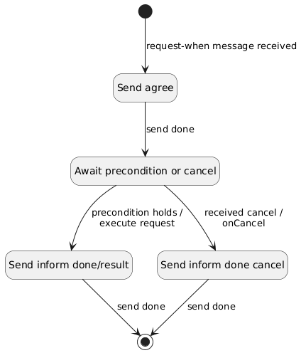 Di seguito è rappresentato il diagramma degli stati per il behaviour `RequestWhenInteractionResponder` in cui si possono notare la presenza di supporto alla cancellazione e la transizione *precondition holds* che, come detto in precedenza, sarà attivata da eventi esterni.
