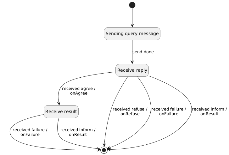 Come risultato delle decisioni discusse in precedenza la maggior parte dei behaviour per i protocolli di interazione sono semplici macchine a stati finiti che effettuano una serie di send e receive di messaggi ACL. Di seguito è rappresentato il diagramma degli stati per un behaviour `QueryInteractionProtocolInitiator`.