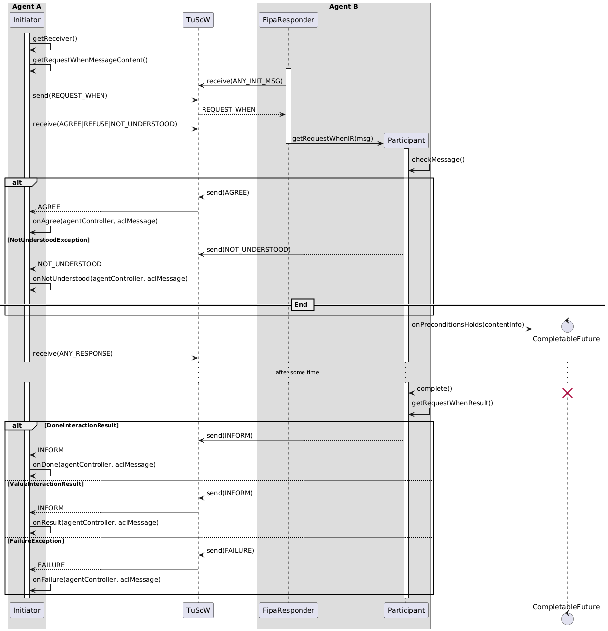 L'agente B esegue un behaviour `FipaResponder` che una volta ricevuto il messaggio request-when costruirà un behaviour più specifico (*participant*) per rispondere all'interazione.