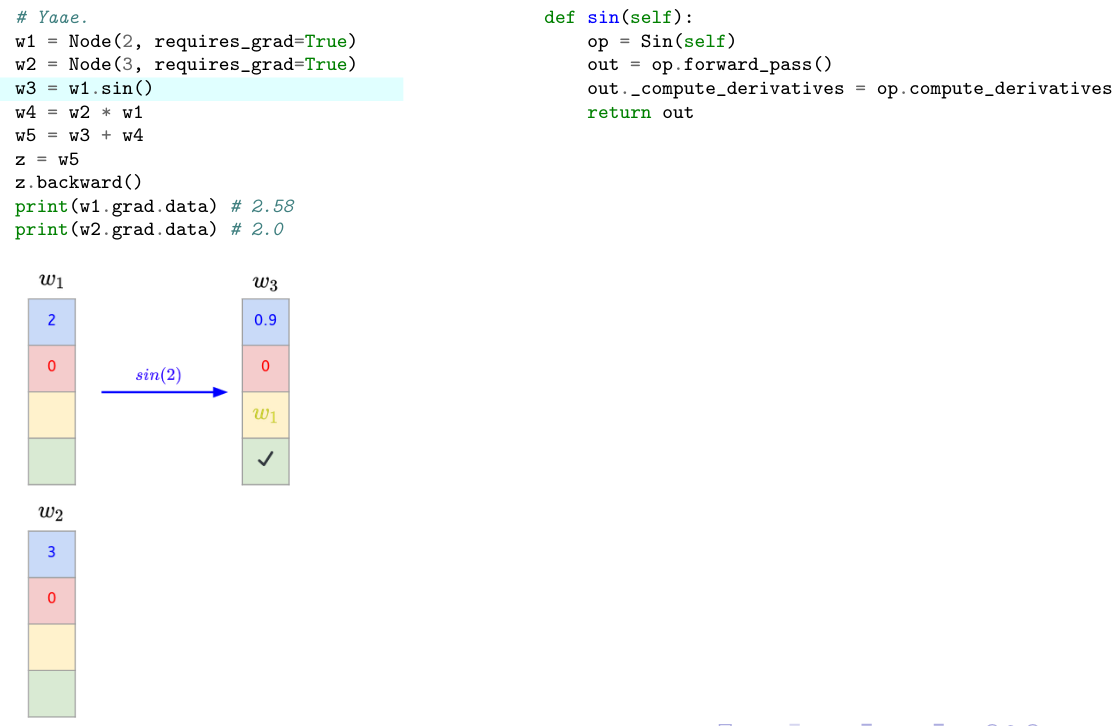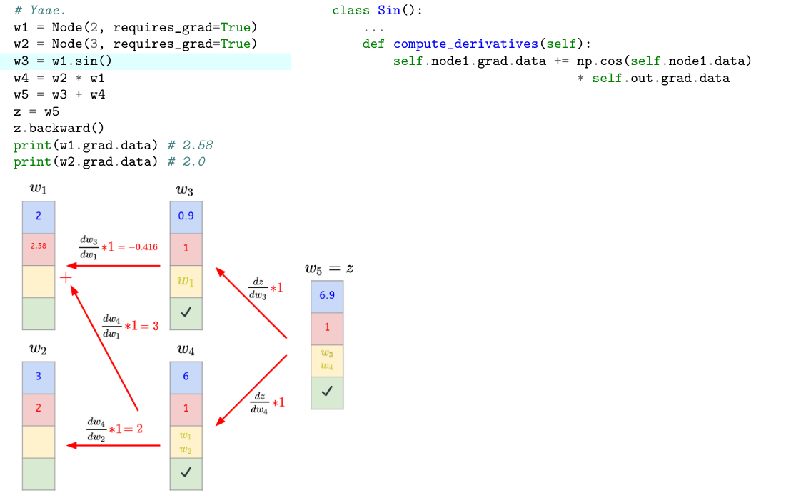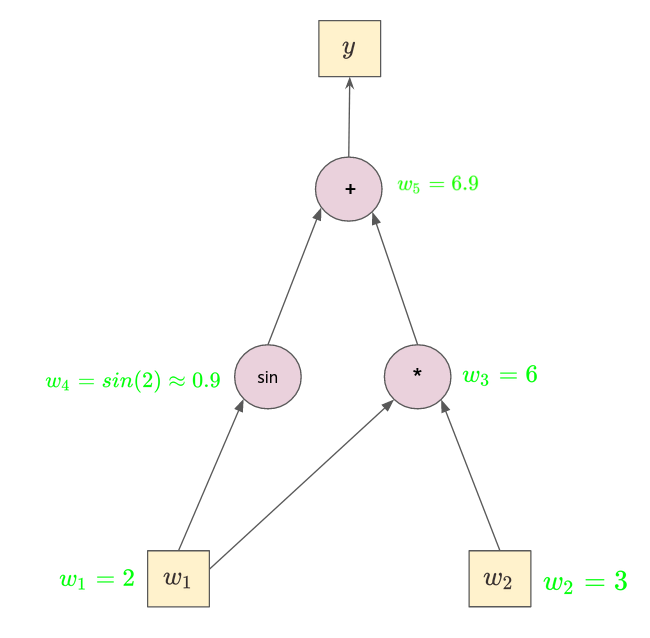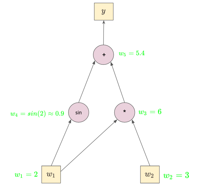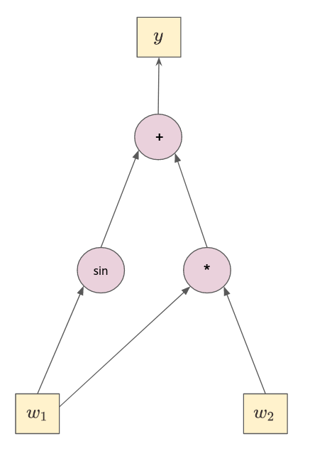 \frac{\mathrm{d} y}{\mathrm{d} w_1} &= \bar{w_1} = cos(2) + 3 \approx 2.58