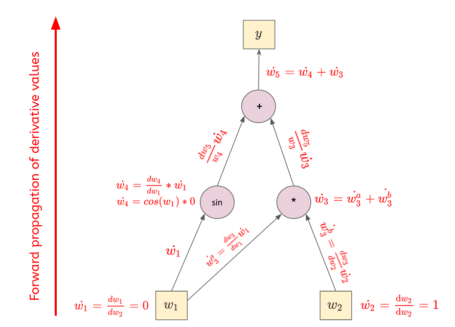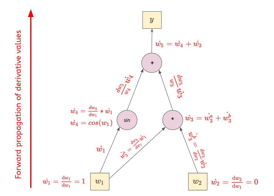 - In forward AD mode, we traverse the chain rule from **right to left**. That is, according to our simple composition function, we first compute $\frac{\mathrm{d} w_1}{\mathrm{d} x}$ and then $\frac{\mathrm{d} w_2}{\mathrm{d} w_1}$ and finally $\frac{\mathrm{d} y}{\mathrm{d} w_2}$.