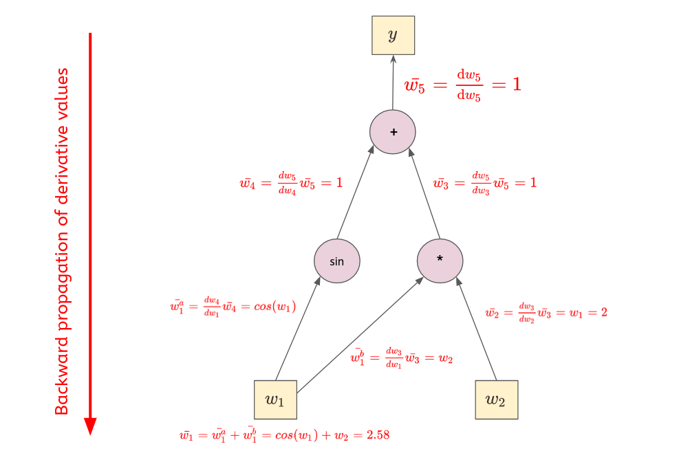 - Reverse automatic differentiation is pretty much like Forward AD but this time,  we traverse the chain rule from **left to right**. That is,  according to our simple composition function, we first compute $\frac{\mathrm{d} y}{\mathrm{d} w_2}$ and then $\frac{\mathrm{d} w_2}{\mathrm{d} w_1}$ and finally $\frac{\mathrm{d} w_1}{\mathrm{d} x}$.