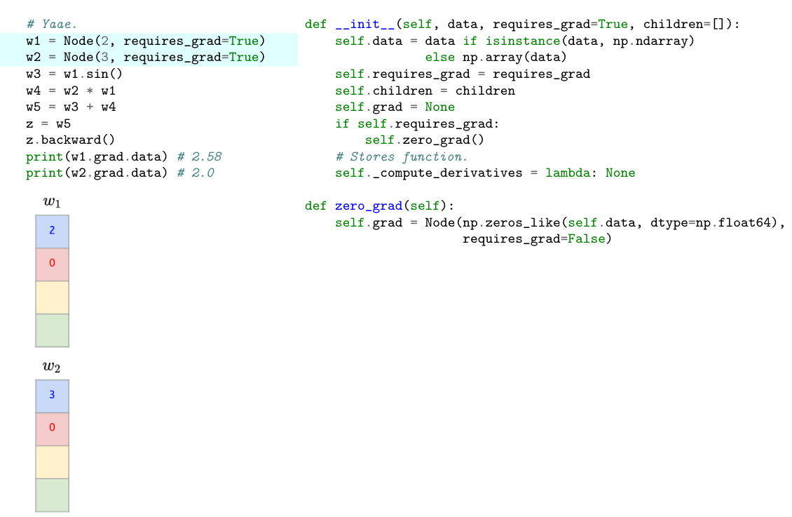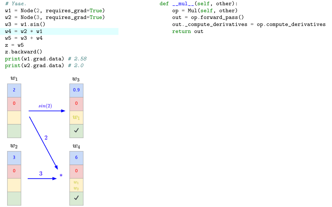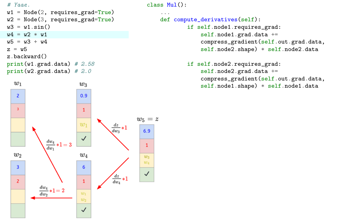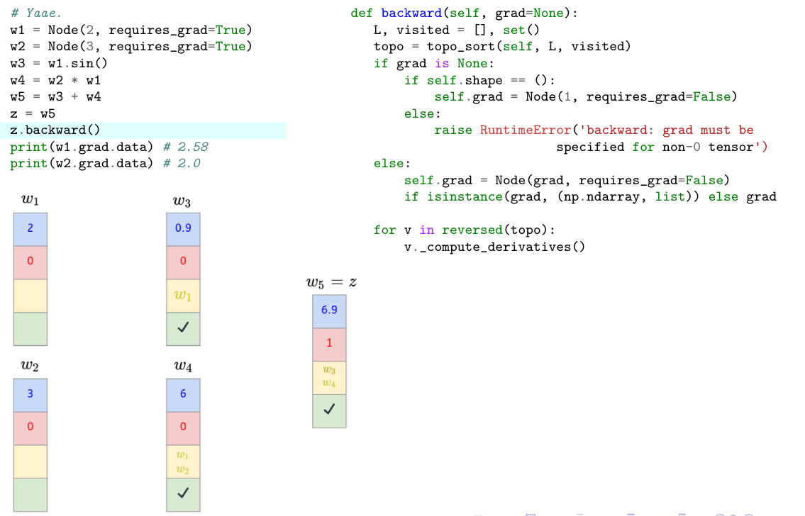 - Indeed, the code structure was designed in such a way it **explicitly reflects the Reverse AD mode logic** that is, ==first a forward pass and then a backward pass (to compute derivatives).==