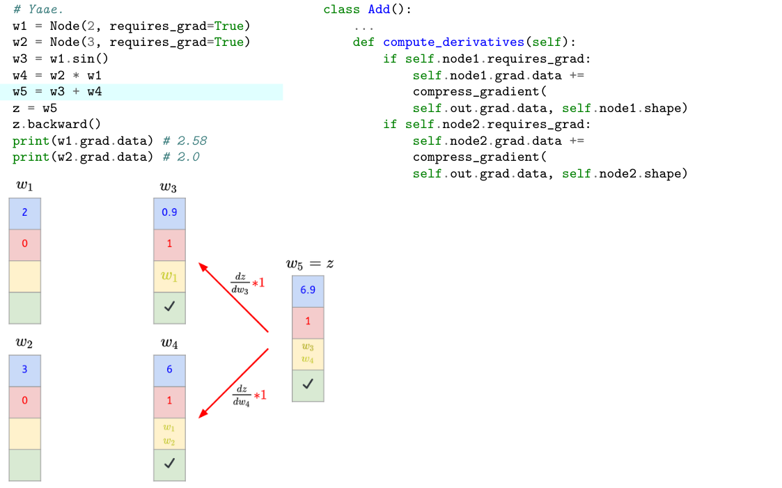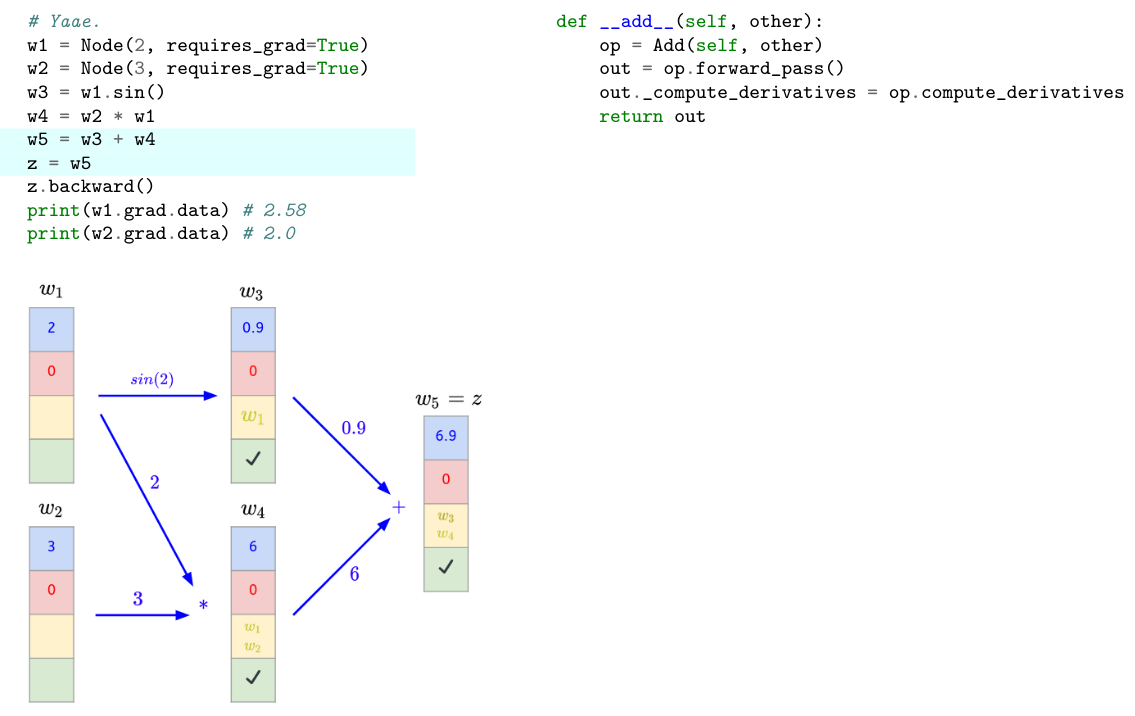 - For each operator/function, the `forward_pass()` will create a new `Node` using the operator/function output with its children stored in `children`.